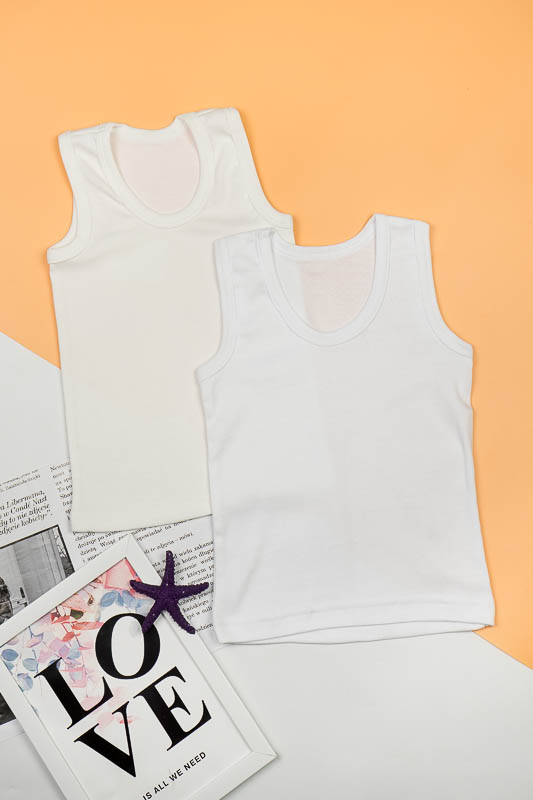 Біла майка для дітей. Пошита з рібани - трикотажного полотна, яке прекрасно тягнеться в ширину і облягає фігуру. Вона дуже м'яка і є однією з найпопулярніших тканин для дитячого одягу і дозволяє виготовляти з нього зручні моделі для малюків.