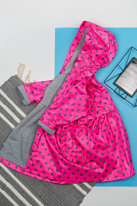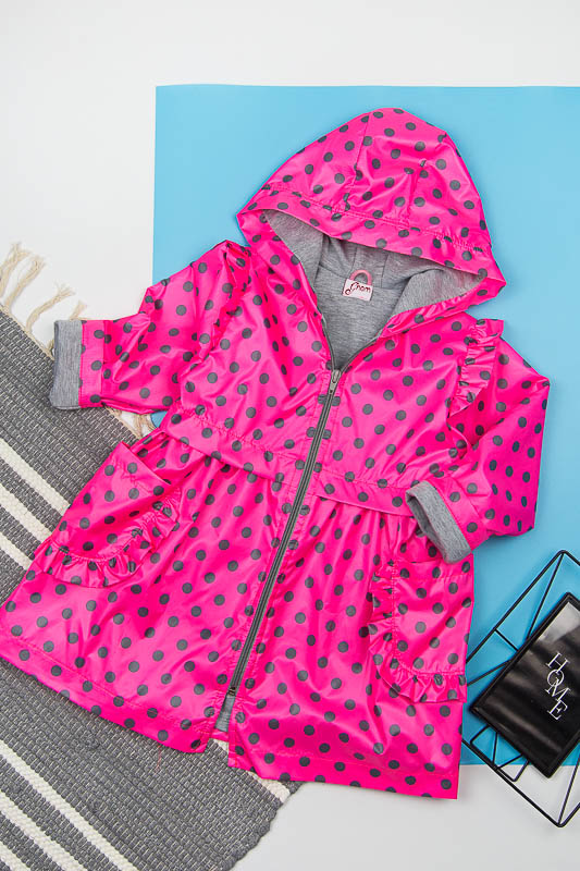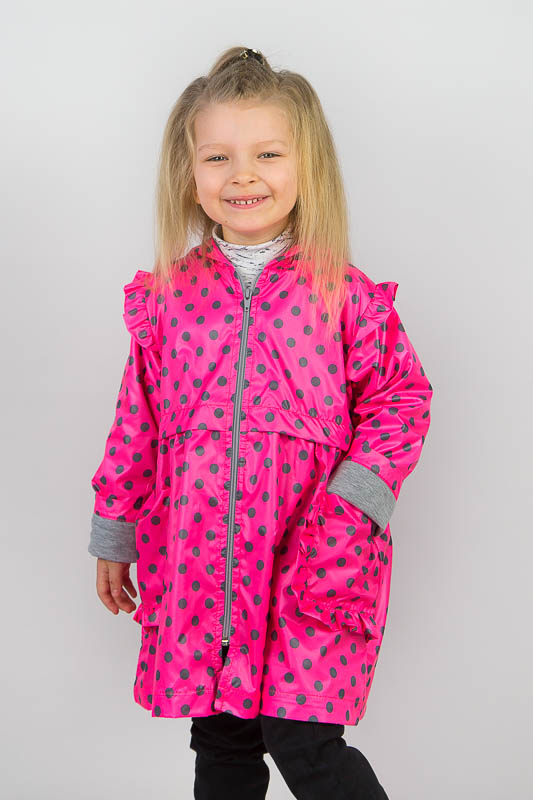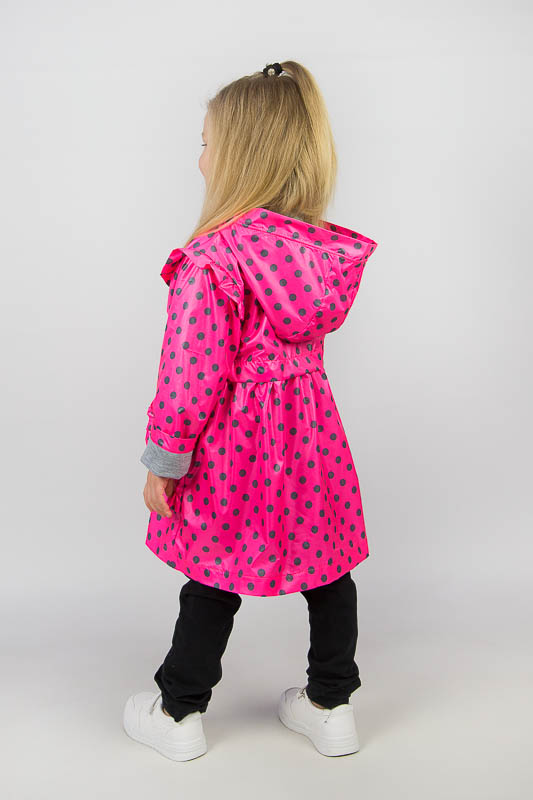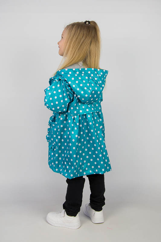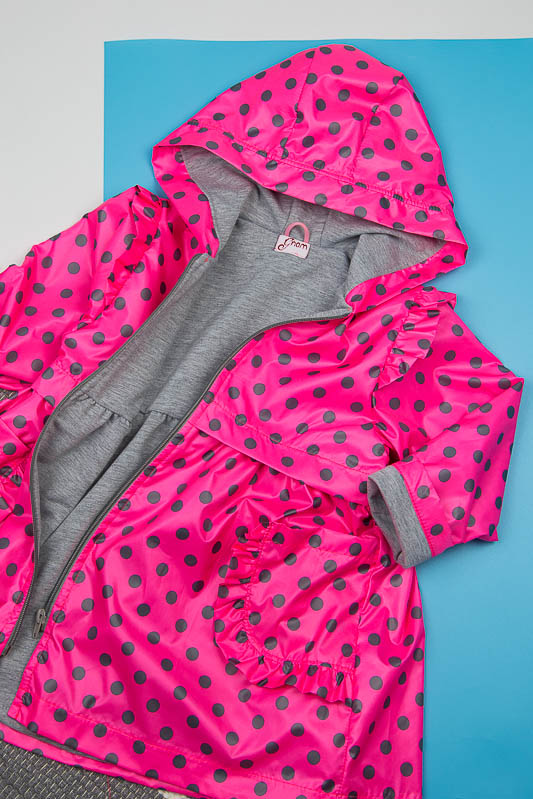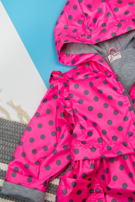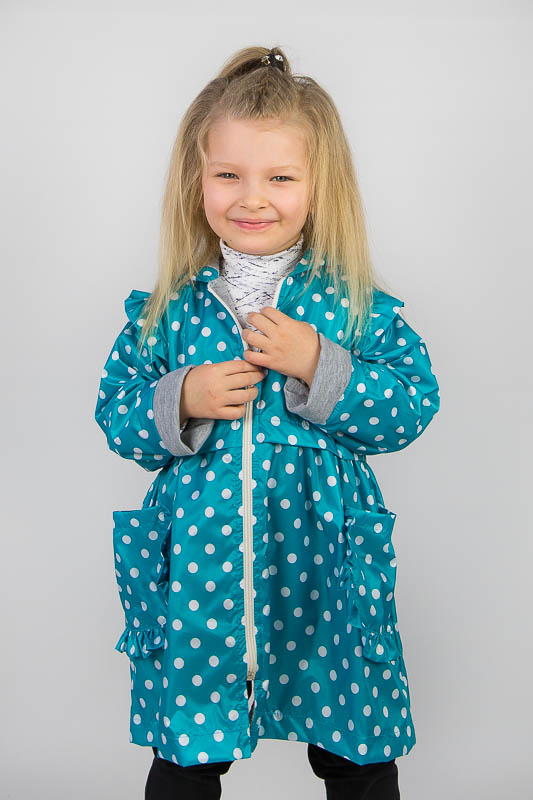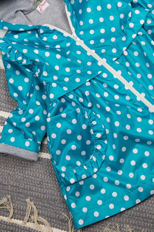Цікавий та яскравий плащ від ТМ «Гном» виготовлений для маленьких модниць від року до п'яти років. Принт у «горошок» у поєднанні з кроєм надають виробу ніжного романтичного образу. Окрасою служать оборки, вставлені в кишені та пройми виробу. Плащ чудово підійде як для теплої демісезонної погоди, так і для дощових літніх днів. Якість матеріалу захистить вашу принцесу від сильного вітру та дощу, а завдяки підкладці вона почуватиметься затишно та комфортно у сиру погоду. Для зручності носіння довжину рукавів виробу можна регулювати за допомогою відворотів. Застібкою служить блискавка. Модель виготовлена з плащівки – щільного, міцного та зносостійкого матеріалу з водовідштовхувальним просоченням. Завдяки їй матеріал не пропускає вологу та холодне повітря. Підкладкою служить трикотажне полотно - двунитка. Це полотно називають футер стрейч. Трикотаж футер має позитивні споживчі якості: добре вбирає вологу; ефективно пропускає повітря; має високу теплозберігаючу здатність. Щоб підтримувати виріб в ідеальній чистоті, достатньо прання при температурі не вище 40°С із застосуванням м'якого миючого засобу. Сушити рекомендується в розправленому вигляді або на плічиках.