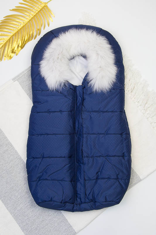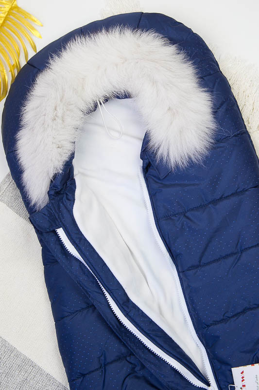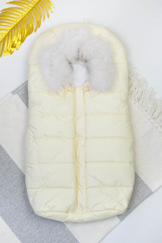 Зимовий конверт віком 0-6 місяців. Верх 100% – поліестер, підкладка – 100% поліестер, наповнювач 100% – поліефір. Застібка-молнія, натуральне хутро - відстібається.