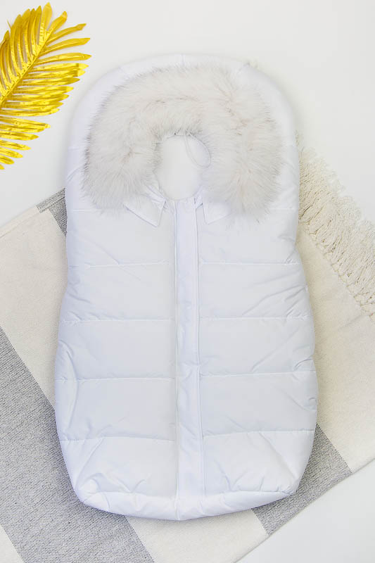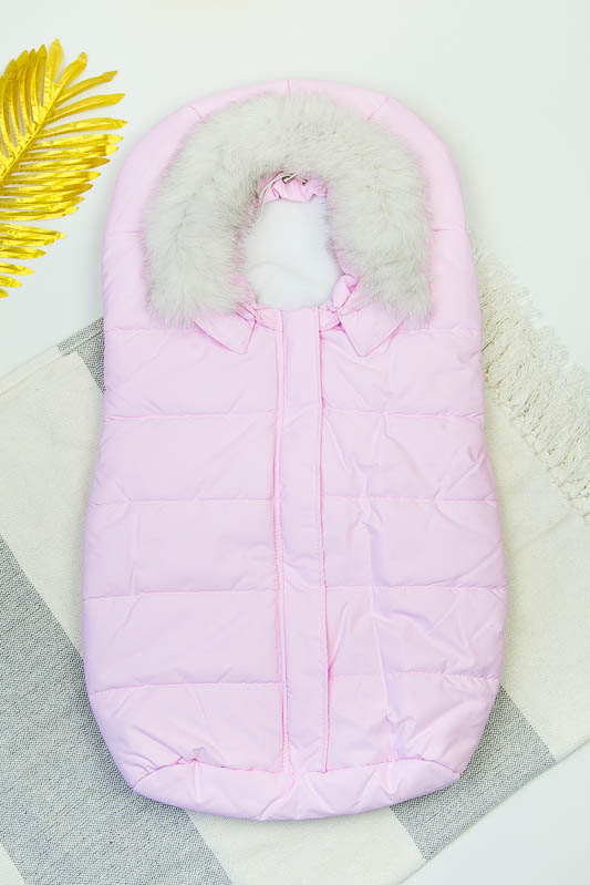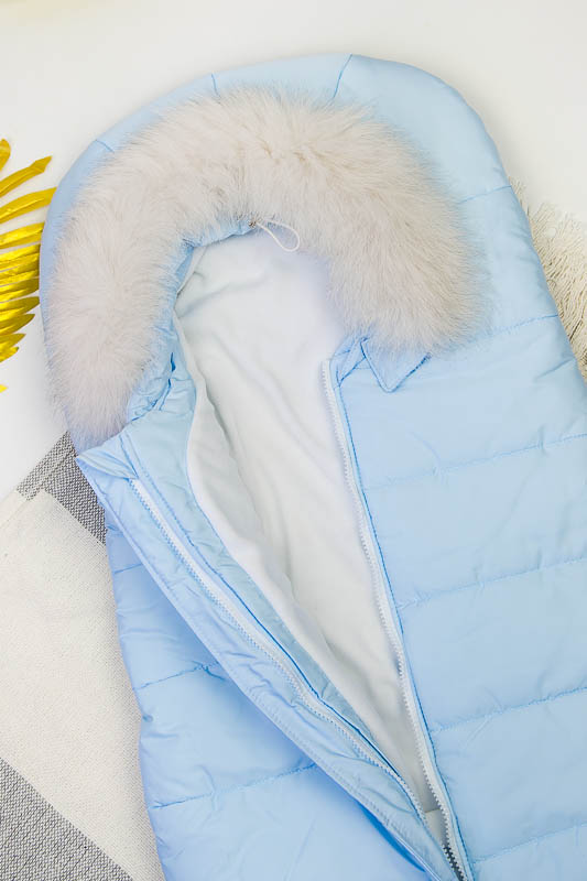 Зимовий конверт віком 0-6 місяців. Верх 100% – поліестер, підкладка – 100% поліестер, наповнювач 100% – поліефір. Застібка-молнія, хутро відстібається.