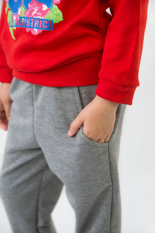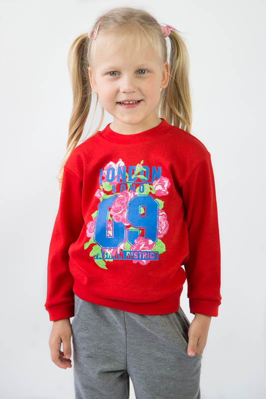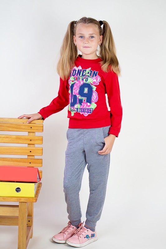 Костюм пошитий з трикотажного полотна - інтерлок та двонитка. Інтерлок це полотно виготовлено зі 100% - ї бавовни. Саму назву матеріал придбав у зв'язку із своєрідним переплетенням його волокон. Ця тканина дуже м'яка та ніжна, тому рекомендується для пошиття дитячих виробів. Двонитка- цей матеріал стійкий до появи ковтунів, довго служить і з часом не змінює форму. Так як це натуральний матеріал, він пропускає повітря і дозволяє шкірі дихати. Після прання може давати усадку, тому рекомендується прати при температурі не більше 30 градусів. Сам костюм складається з водолазки прямого силуету з манжетами, пошита з інтерлоку і штанів з кишенями, низ яких теж має манжети пошитих з двонитки. По переду виробу яскравий принт. Такий костюм буде зручний для прогулянки в прохолодну погоду.