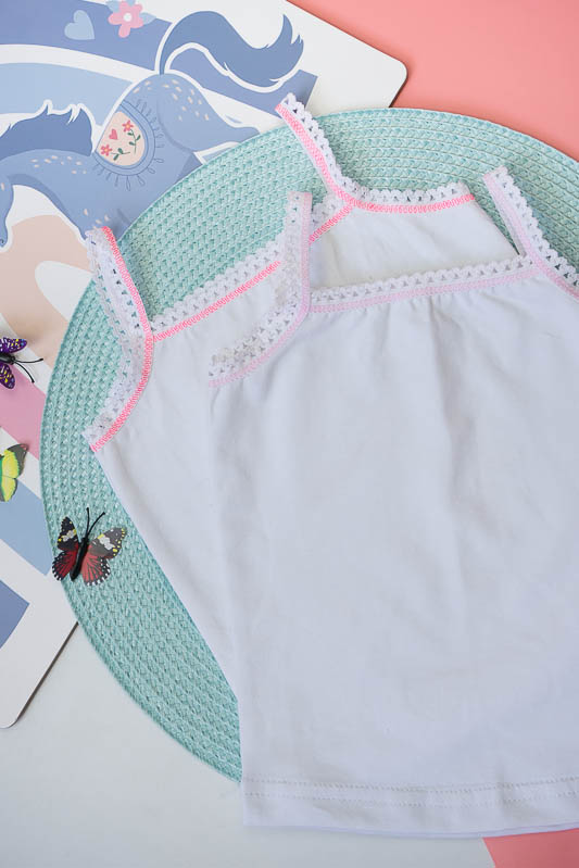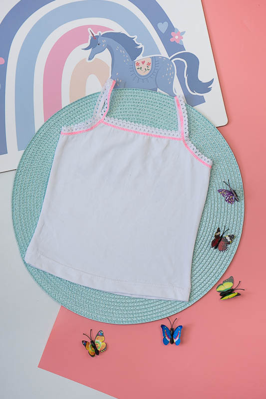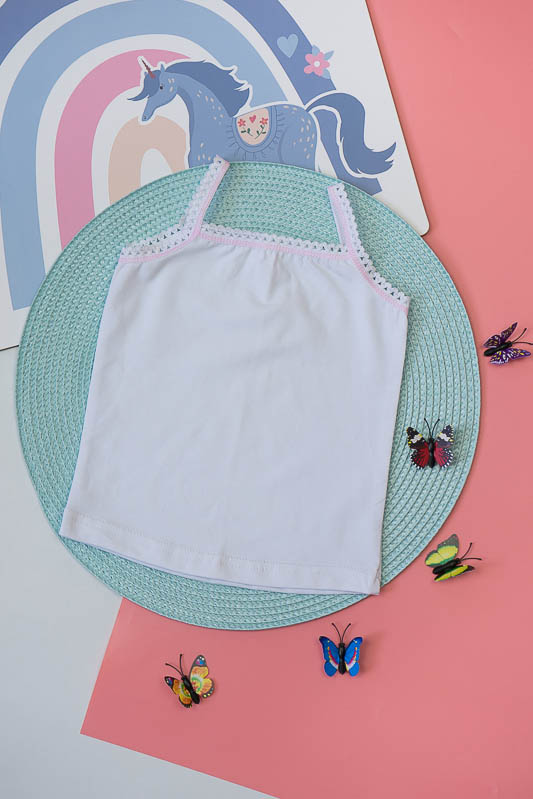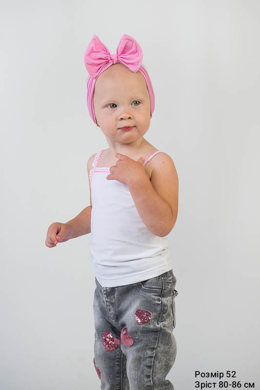 Топ для дівчаток. Модель білого кольору оброблена еластичною тасьмою та прикрашена бантиком. Топ виготовлений із трикотажного полотна – фулікра. Це еластичний та приємний до тіла матеріал, до складу якого входить 95% бавовни та 5% лайкри, що сприяє полотну не витягуватися та зберігати форму після численних прань. Матеріал має добру гігроскопічність, не викликає алергію. Виріб невибагливий у догляді, його можна прати при температурі до 40°C в делікатному або ручному режимі, не використовувати відбілювачі або порошки з відбілювачами.