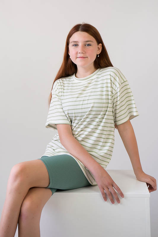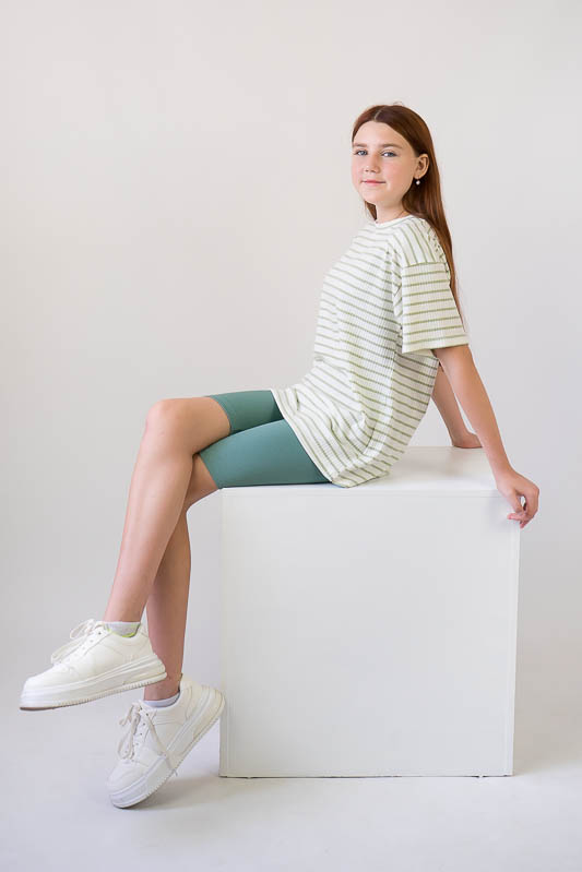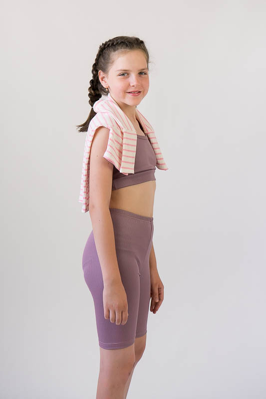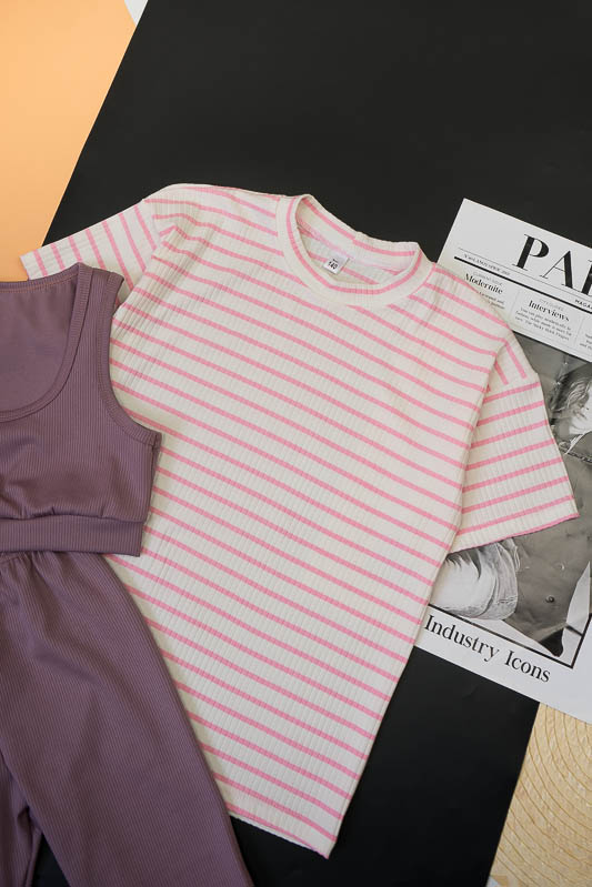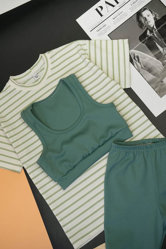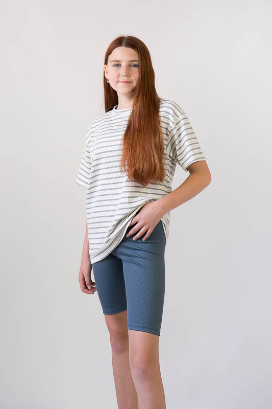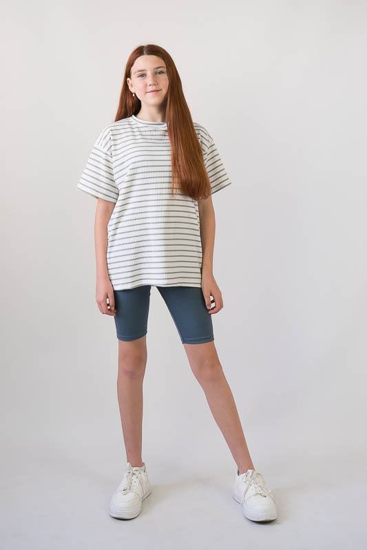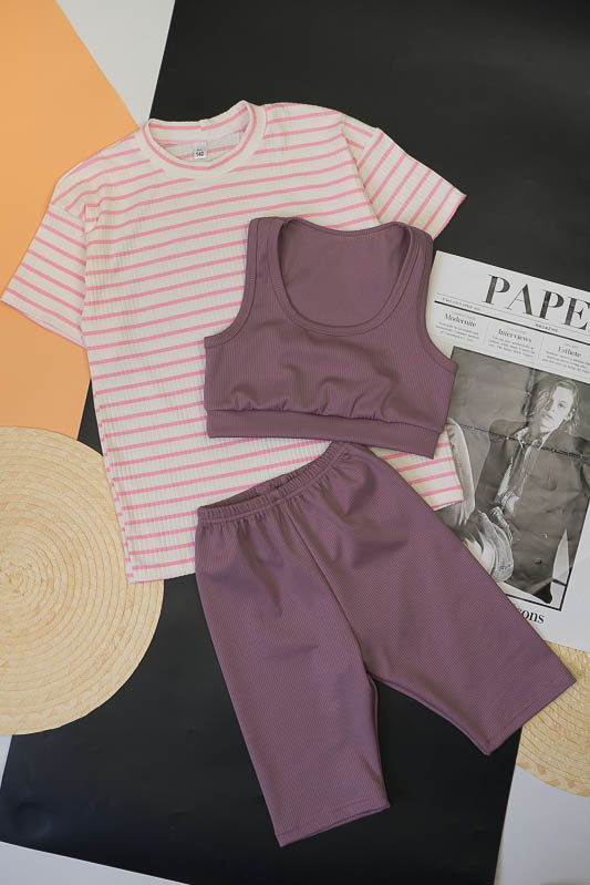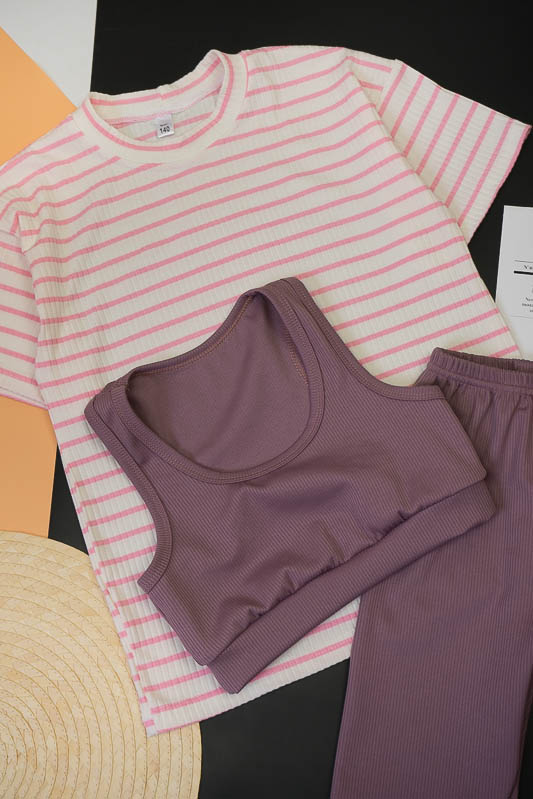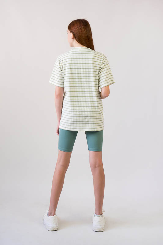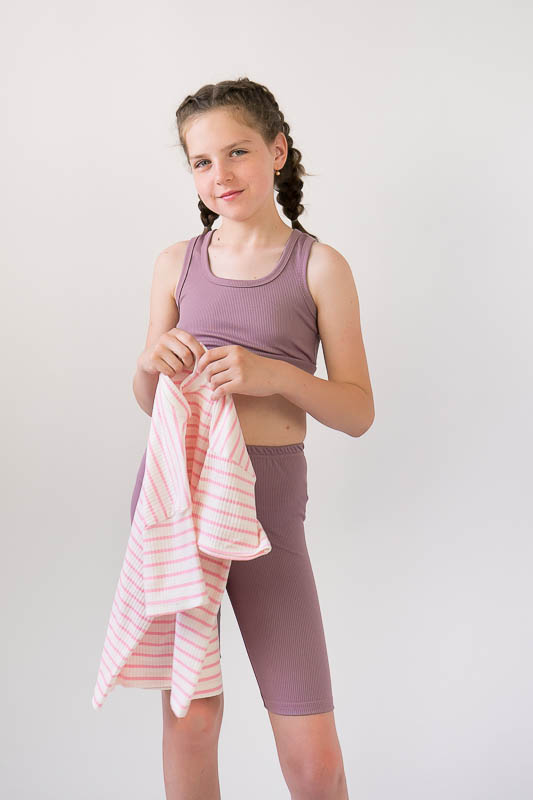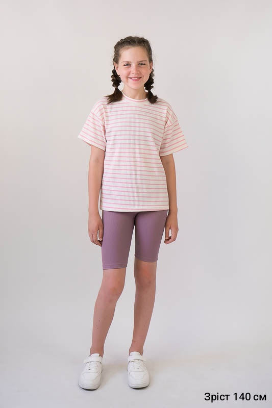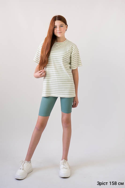 Легкий та практичний комплект в спортивному стилі від ТМ «Гном» виготовлений для дівчат підліткового віку. Складається він з подовженої футболки «oversize», топа та трес. Комплект скомбінований зі смугастого та однотонного полотна у рубчик різної щільності. Завдяки еластичності і м’якості матеріалу, модель не сковує рухів та створює комфорт і зручність. Виготовлений комплект з трикотажу мустанг (86% поліестер, 14% еластан), який є стрейчевим полотном. Матеріал приємно прилягає до тіла, не викликає подразнень та алергії. Підходить для пошиття топів, суконь, стильних трикотажних костюмів та ін. Прати вручну у воді не більше 30°C, сильно не віджимати, прасувати не обов’язково.