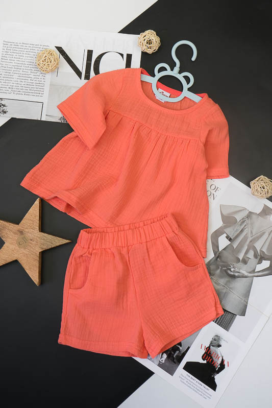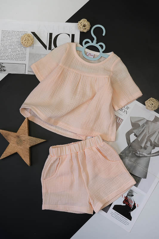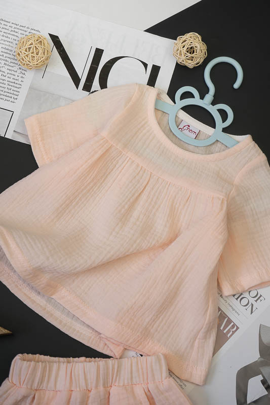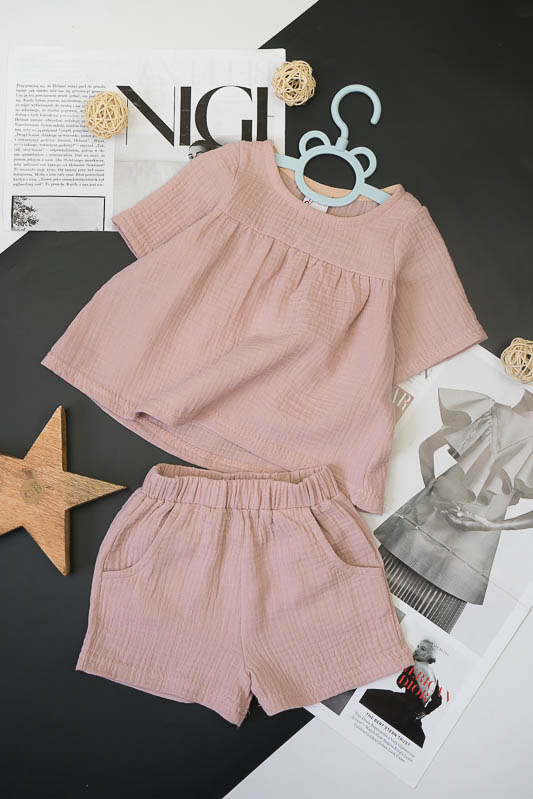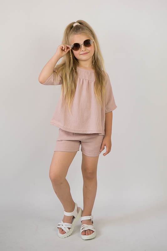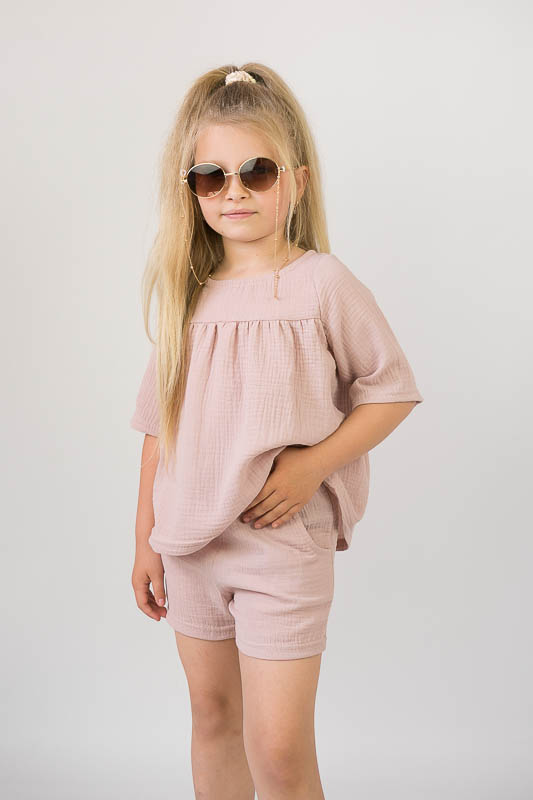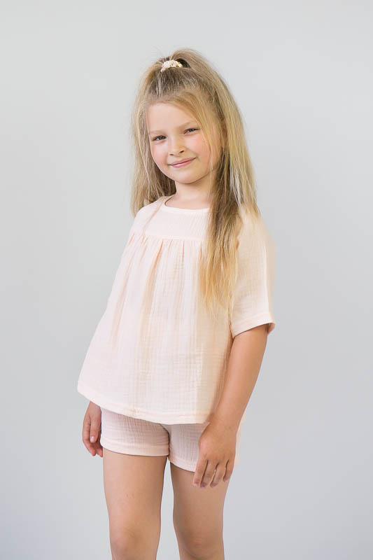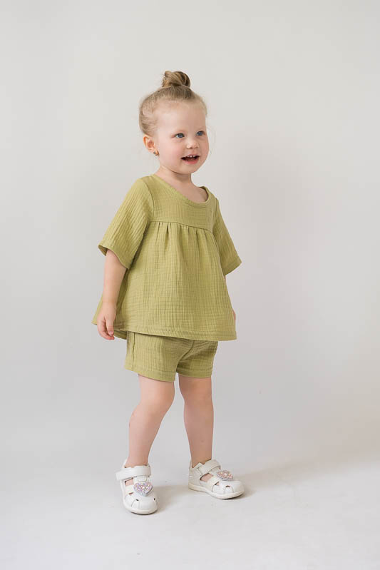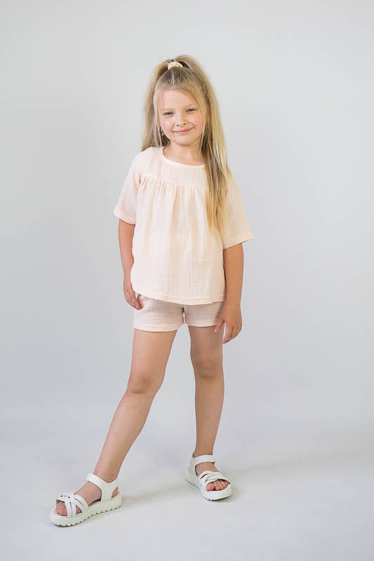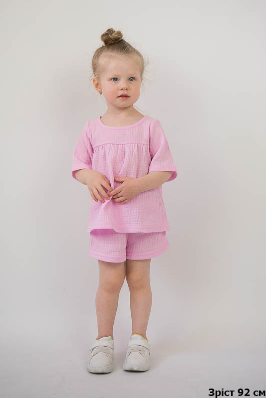 У літні спекотні дні кожна мама бажає захистити свою дитину від прямих сонячних променів. Для таких випадків ТМ «Гном» пропонує легкий та тонкий бавовняний комплект для дівчинки, який складається з вільної блузи та шорт. В такому одязі не спекотно та комфортно. Крім зручного крою перевагою комплекту є матеріал, з якого він виготовлений. Це муслін – бавовняна тканина, яку обирають для пошиття літнього одягу. Муслін – дуже тонка, майже прозора тканина, дуже легка та водночас міцна, добре вбирає вологу та швидко висихає, має надійний захист від ультрафіолетових променів. Щоб муслінові вироби служили вам довго та мали привабливий вигляд, за ними потрібно правильно доглядати, а саме: прати в теплій воді при температурі не більше 40°C; перед сушінням добре струснути та розправити; довго не сушити на сонці; прасувати в напівсухому вигляді з використанням пару.