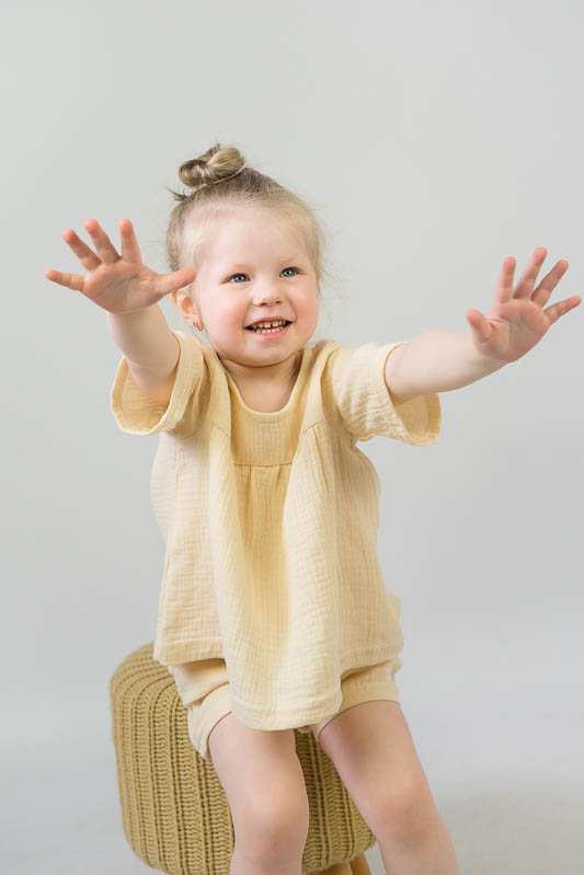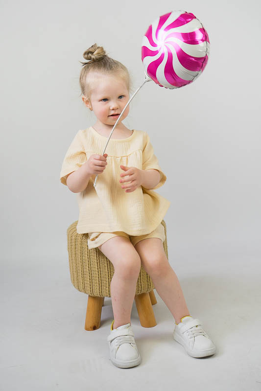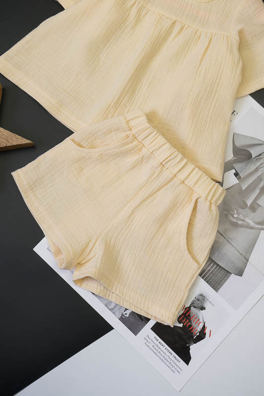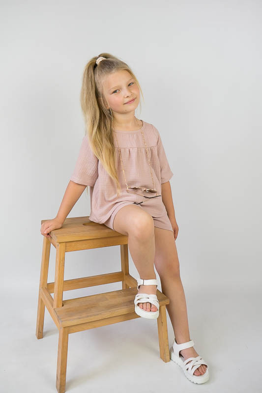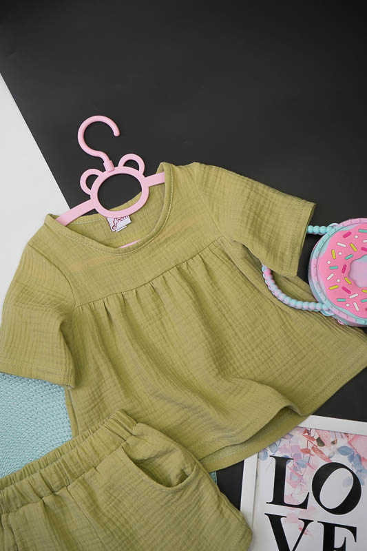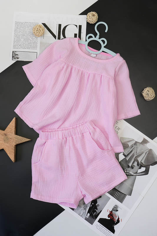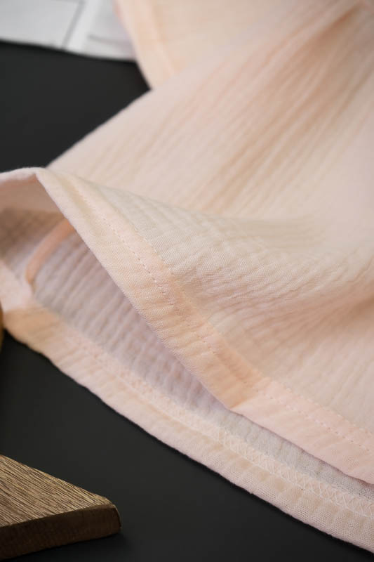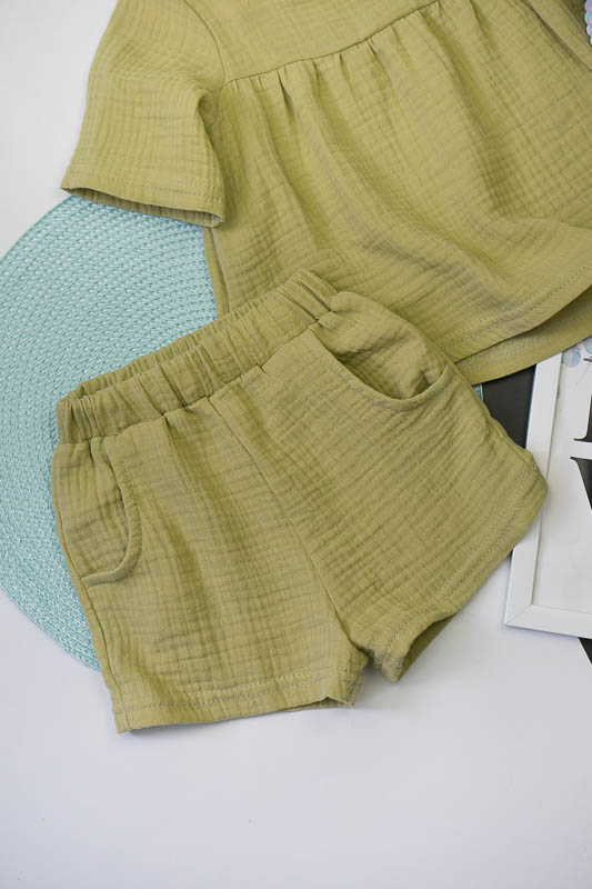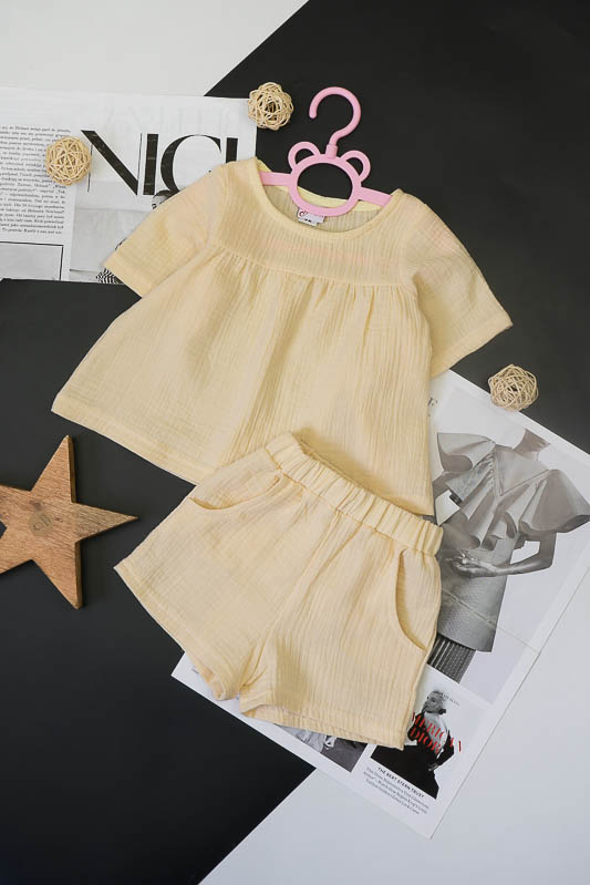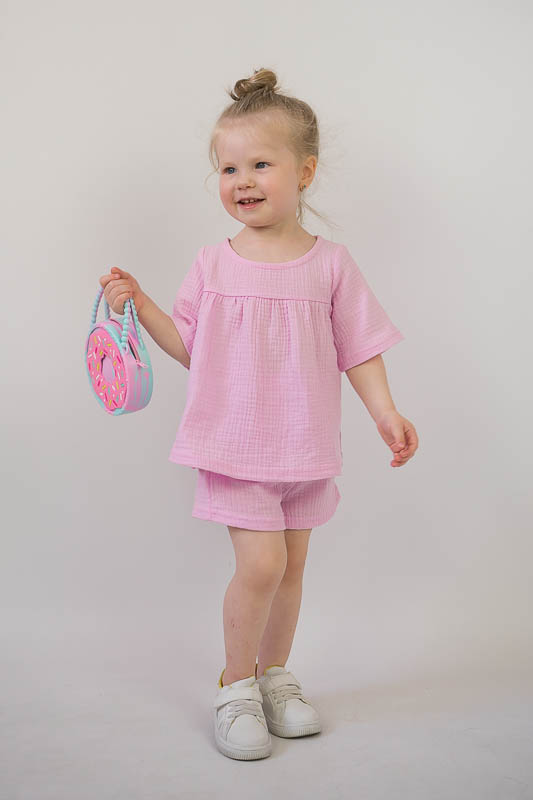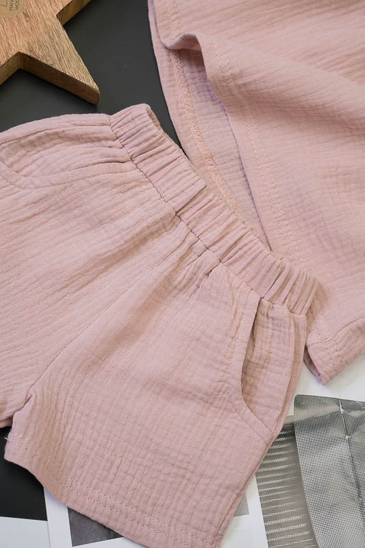 У літні спекотні дні кожна мама бажає захистити свою дитину від прямих сонячних променів. Для таких випадків ТМ «Гном» пропонує легкий та тонкий бавовняний комплект для дівчинки, який складається з вільної блузи та шорт. В такому одязі не спекотно та комфортно. Крім зручного крою перевагою комплекту є матеріал, з якого він виготовлений. Це муслін – бавовняна тканина, яку обирають для пошиття літнього одягу. Муслін – дуже тонка, майже прозора тканина, дуже легка та водночас міцна, добре вбирає вологу та швидко висихає, має надійний захист від ультрафіолетових променів. Щоб муслінові вироби служили вам довго та мали привабливий вигляд, за ними потрібно правильно доглядати, а саме: прати в теплій воді при температурі не більше 40°C; перед сушінням добре струснути та розправити; довго не сушити на сонці; прасувати в напівсухому вигляді з використанням пару.