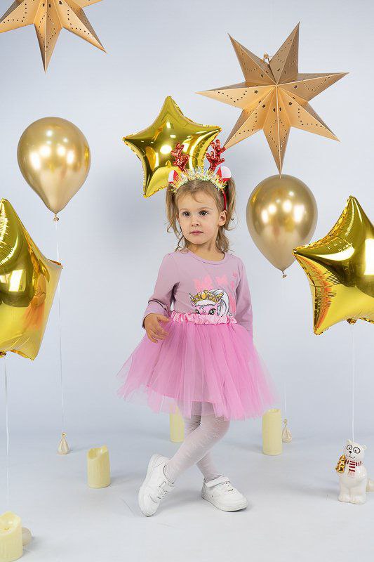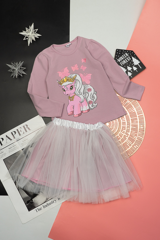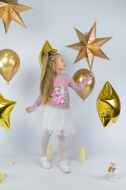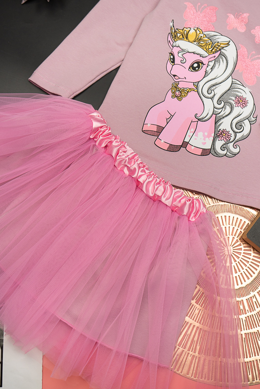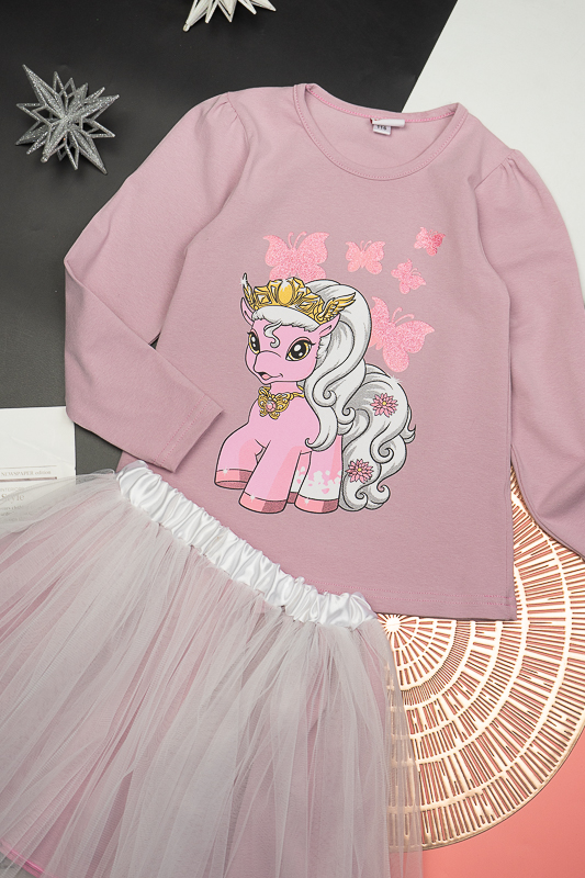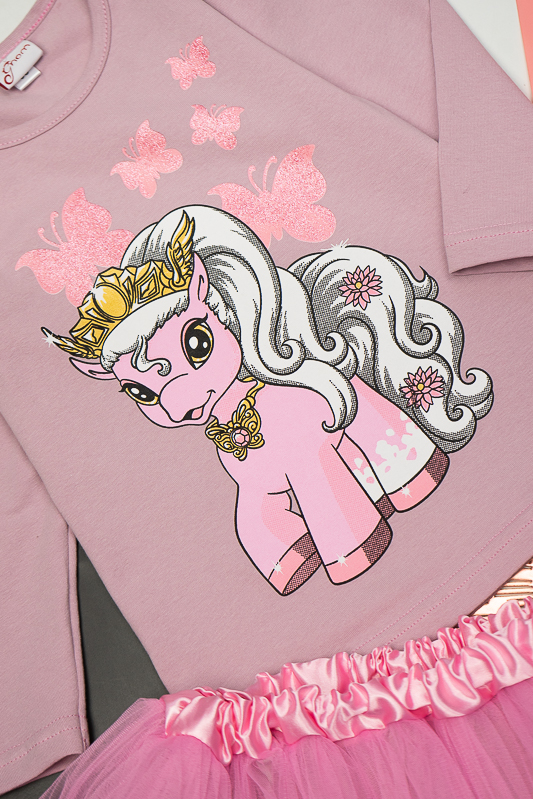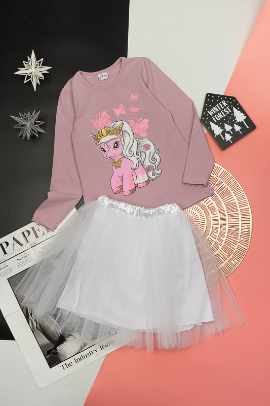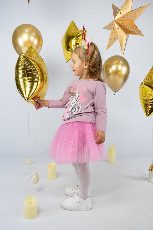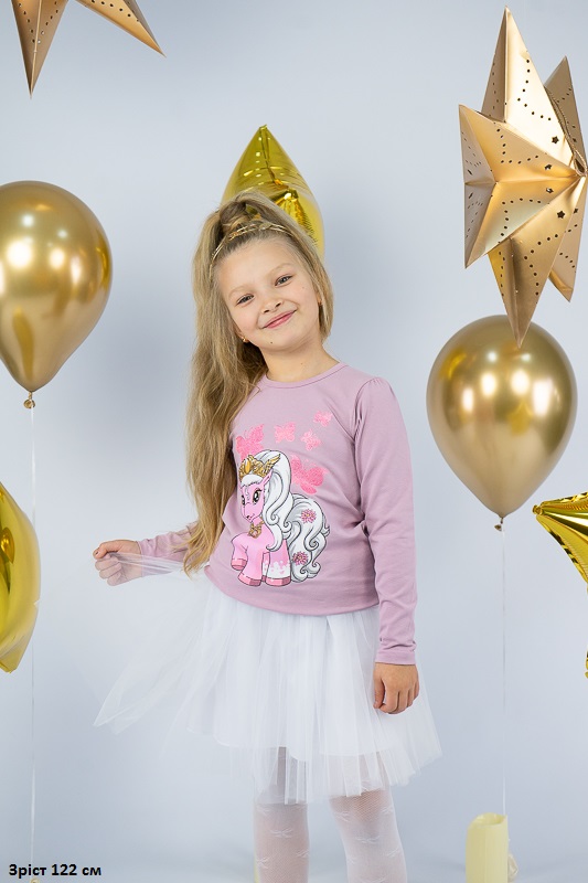 ТМ «Гном» пропонує святковий комплект для дівчаток дошкільного віку, який поєднує лонгслів, прикрашений яскравим малюнком та богатошарову пишну спідницю. Лонгслів виготовлений з трикотажного м'якого полотна - фулікра. Це стрейчевий кулір, що складається з 95% бавовни та 5% лайкри. Полотно еластичне і приємне до тіла. Матеріал має добру гігроскопічність, не викликає алергію. Спідниця виконана з євросітки – м'якого фатина, яка чудово тримає форму. Підкладкою спідниці служить трикотажне полотно на бововняній основі. Лонгслів невибагливий у догляді, його можна прати при температурі до 40°C в делікатному або ручному режимі, не використовувати відбілювачі або порошки з відбілювачами. Прання спідниці відбувається за низької температури; сушіння природним шляхом, на віддаленні від батарей і не під сонцем; використання м'якого миючого засобу.