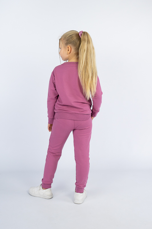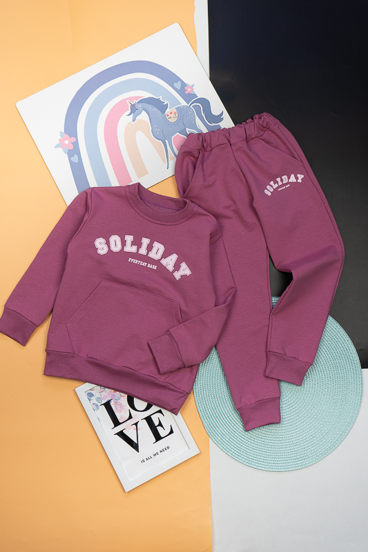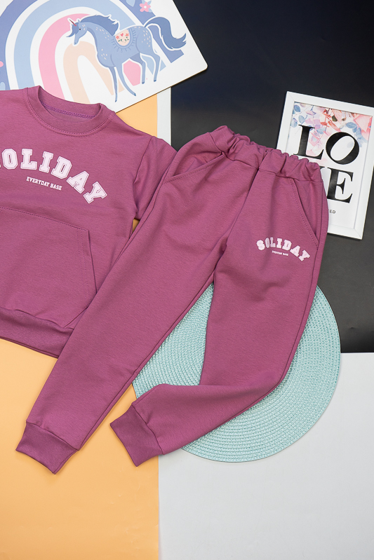 Зручний костюм виготовлений для дівчаток від дошкільного до підліткового віку. Костюм складається з худі та штанів на манжетах. Класична однотонна модель прикрашена принтом та кишенями - кенгуру на передній частині худі. Таке доповнення робить модель стильною, модною, при цьому практичною та універсальною річчю. Виготовлений костюм із м'якого трикотажного полотна – двунитка. Трикотаж має позитивні споживчі якості, а саме: добре вбирає вологу, ефективно пропускає повітря, має високу теплоощадну здатність, не утворює пилок (ковтунів), не витягується при носінні, простий у догляді. Рекомендується прати в «Делікатному» або «Ручному» режимі при температурі не вище 40°C, прасувати з виворотної сторони.