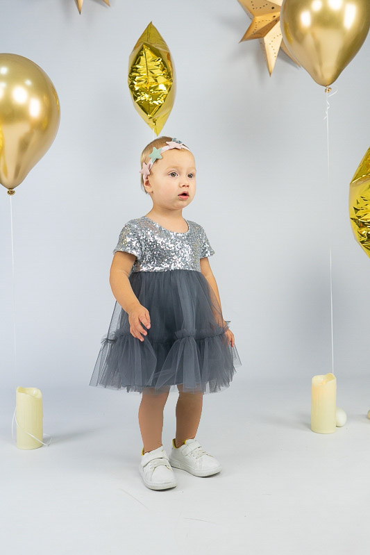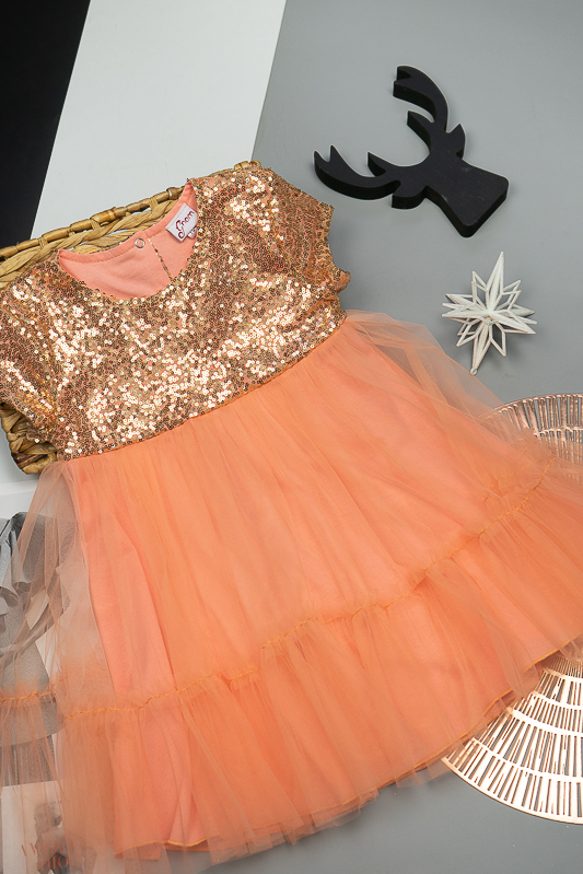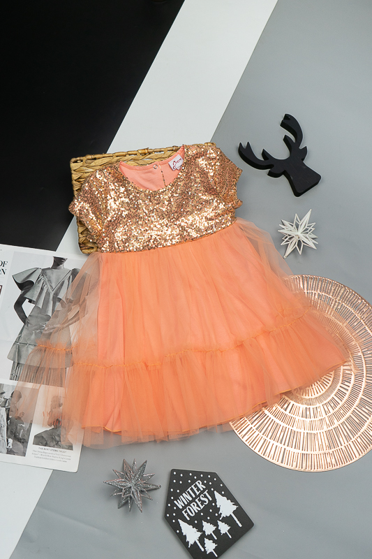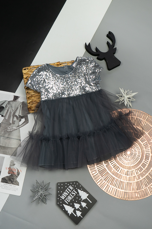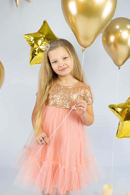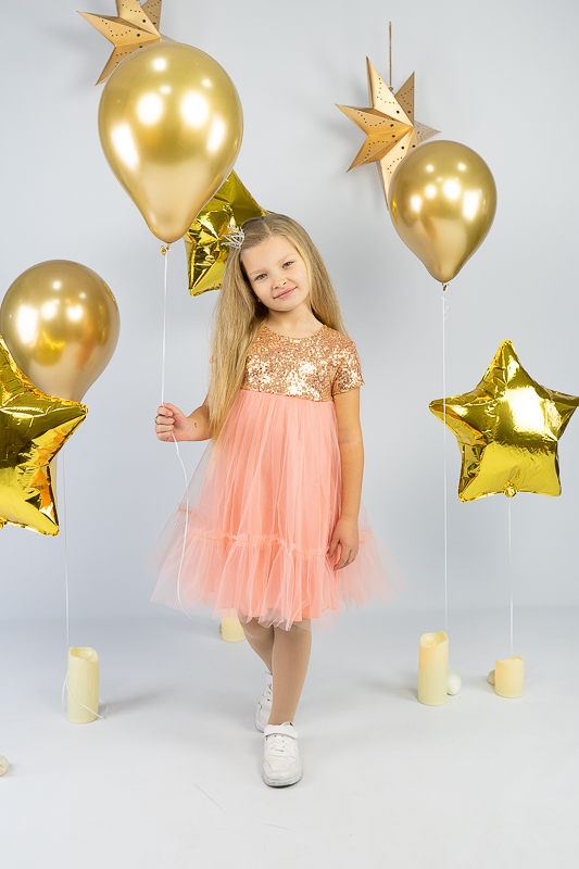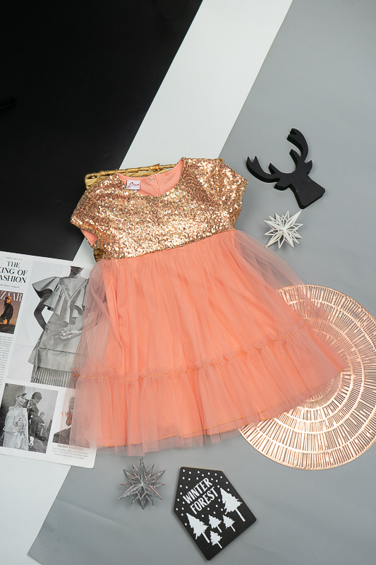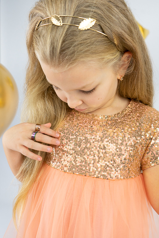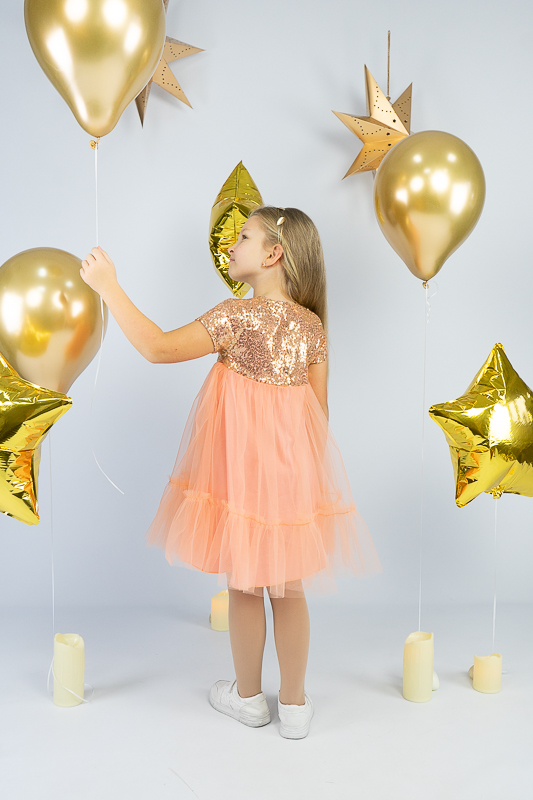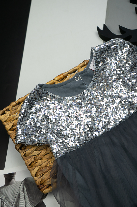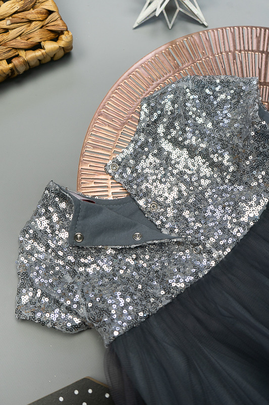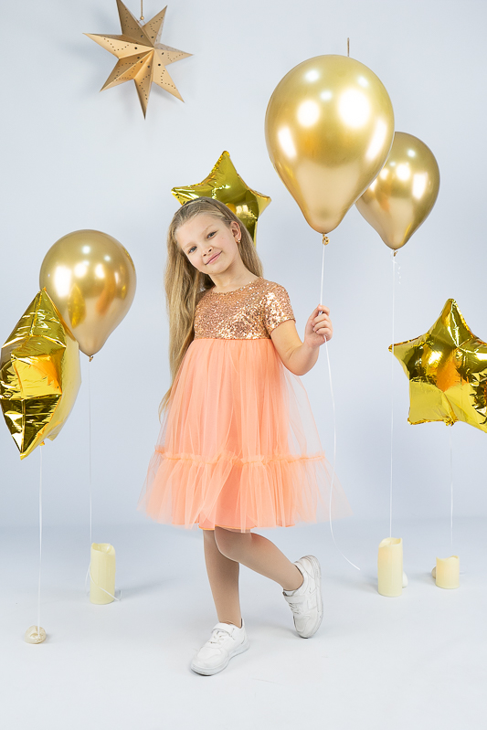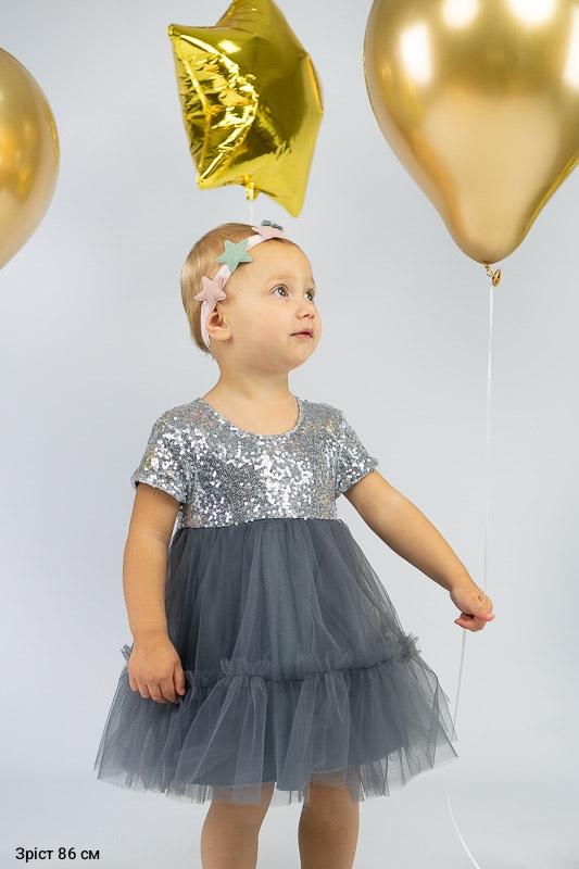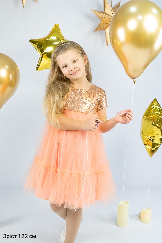 У цій ошатній і легкій сукні на будь-якому святі ваша дівчинка буде виглядати як справжня принцеса. Паєтки, що переливаються, пишна двоярусна спідниця, створять незабутній образ. Сукня пошита із комбінації різних матеріалів. Верхня частина сукні виготовлена з паєткового матеріалу, а верхні шари спідниці з євросітки - м'якого фатина, що чудово тримає форму. Загальною підкладкою служить тонке і м'яке кулірне полотно, яке захищає від дискомфорту паєток. По спинці проходить застібка – кнопки. Прати виріб потрібно за невисокої температури – 30°C. Це може бути й ручне, і машинне прання; використовувати для прання потрібно звичайний порошок, ніяких відбілюючих та хлоровмісних засобів; не варто сильно віджимати річ і сушити під прямим сонячним промінням.