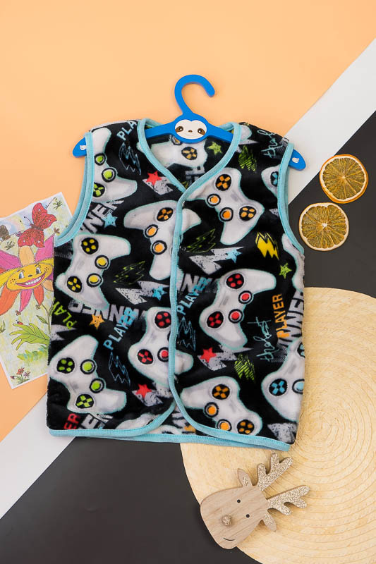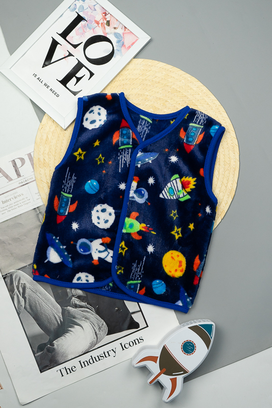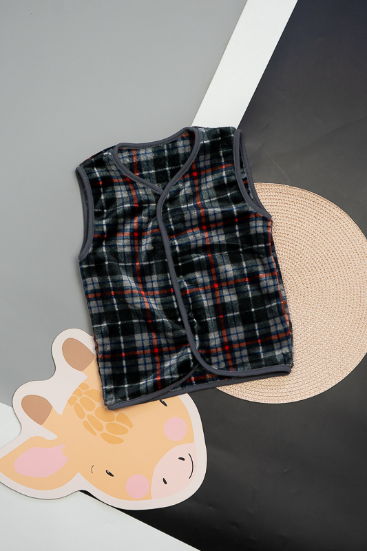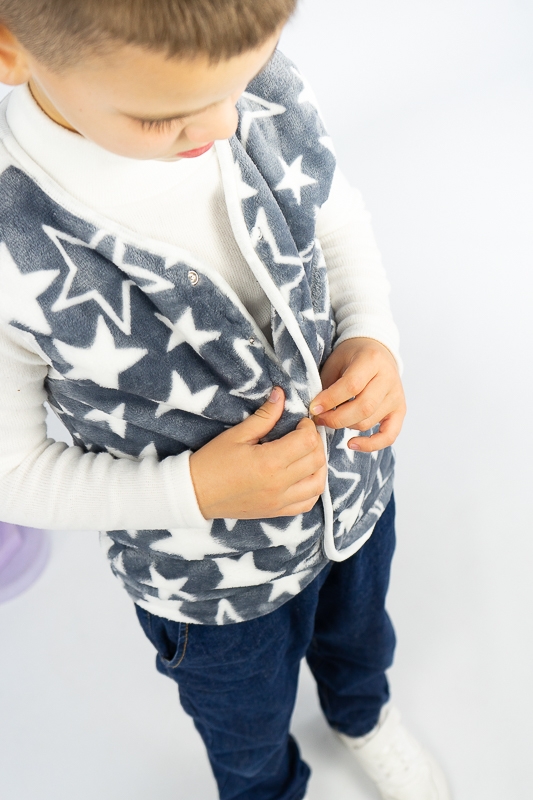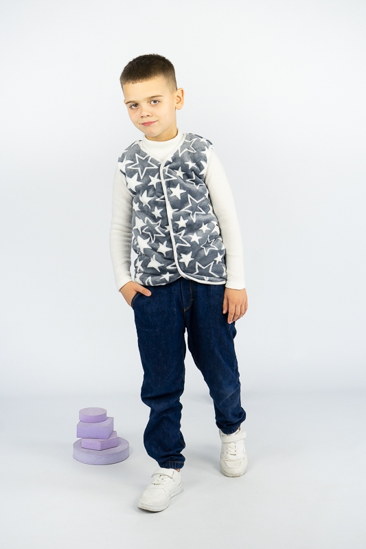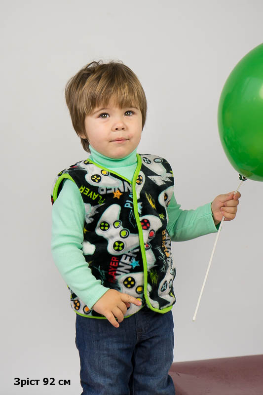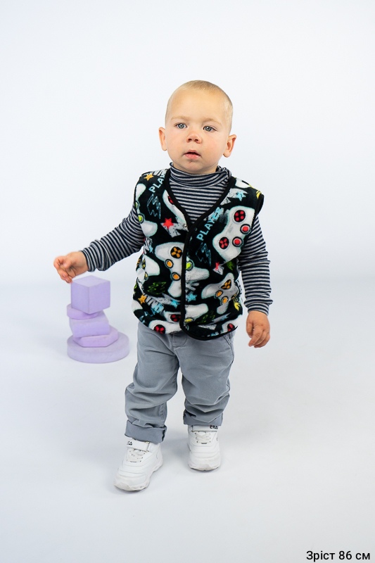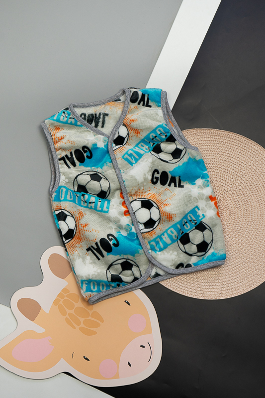 Така жилетка пошита з трикотажного полотна - велсофт або махра. Махра (Велсофт) - м'яка, легка та міцна тканина. Гіпоалергенна, характеризується високою зносостійкістю та дарує приємні відчуття при носінні. Вироби з махри (велсофту) мають прекрасну повітропроникність і високу гігієнічність, тримають тепло і не мнуться після прання. З такої тканини можна пошити зручний і гарний халат. Крім одягу, велсофт використовують для пошиття теплих ніжних ковдр. Велсофт швидко завоював популярність, особливо при пошитті дитячого одягу, адже широка палітра кольорів дозволяє пошити з велсофту дитячі шапочки, комбінезончики, халатики, шкарпетки, штанці, кофточки. Довгий ворс, міцність, м'якість цієї тканини дозволили їй швидко завоювати свою нішу на ринку та стати високозатребуваною. Махра полірована має ще більшу м'якість і ніжність, а також має легкий блиск. Цей жилет зігріє Ваших дітей у холодну погоду.