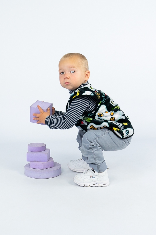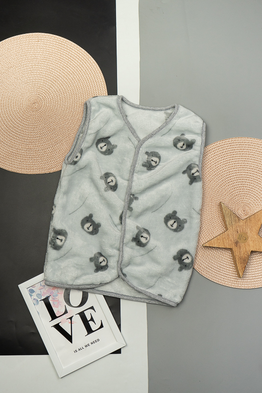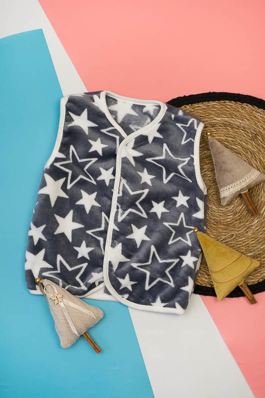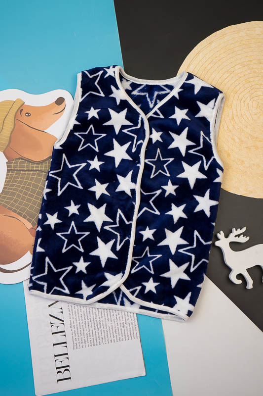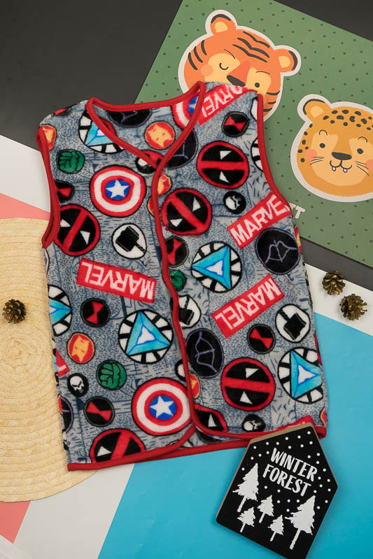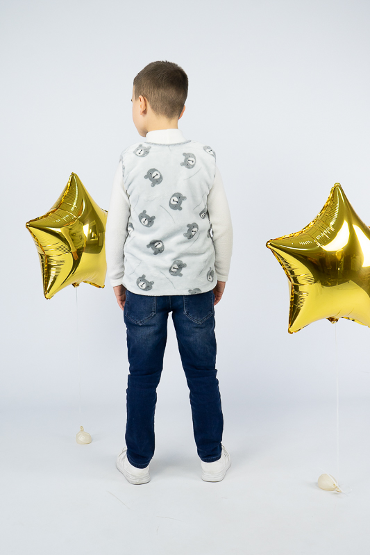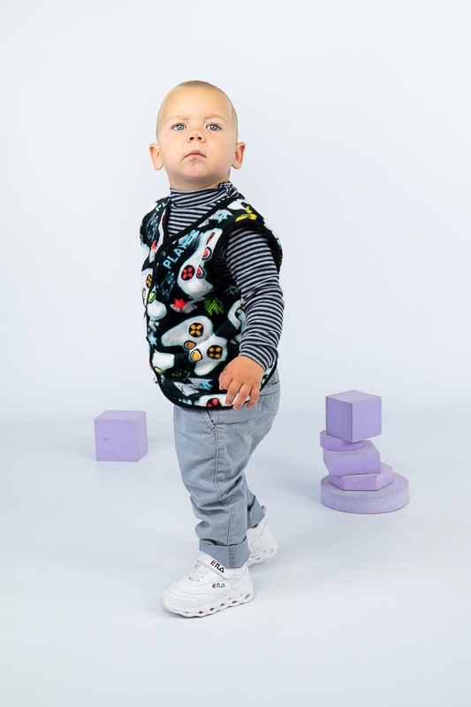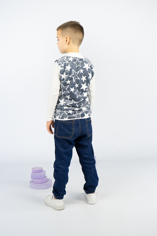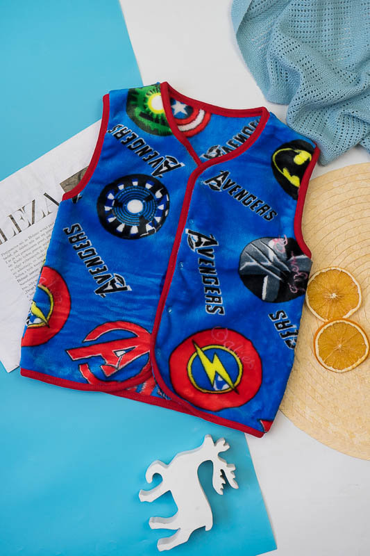 Така жилетка пошита з трикотажного полотна - велсофт або махра. Махра (Велсофт) - м'яка, легка та міцна тканина. Гіпоалергенна, характеризується високою зносостійкістю та дарує приємні відчуття при носінні. Вироби з махри (велсофту) мають прекрасну повітропроникність і високу гігієнічність, тримають тепло і не мнуться після прання. З такої тканини можна пошити зручний і гарний халат. Крім одягу, велсофт використовують для пошиття теплих ніжних ковдр. Велсофт швидко завоював популярність, особливо при пошитті дитячого одягу, адже широка палітра кольорів дозволяє пошити з велсофту дитячі шапочки, комбінезончики, халатики, шкарпетки, штанці, кофточки. Довгий ворс, міцність, м'якість цієї тканини дозволили їй швидко завоювати свою нішу на ринку та стати високозатребуваною. Махра полірована має ще більшу м'якість і ніжність, а також має легкий блиск. Цей жилет зігріє Ваших дітей у холодну погоду.