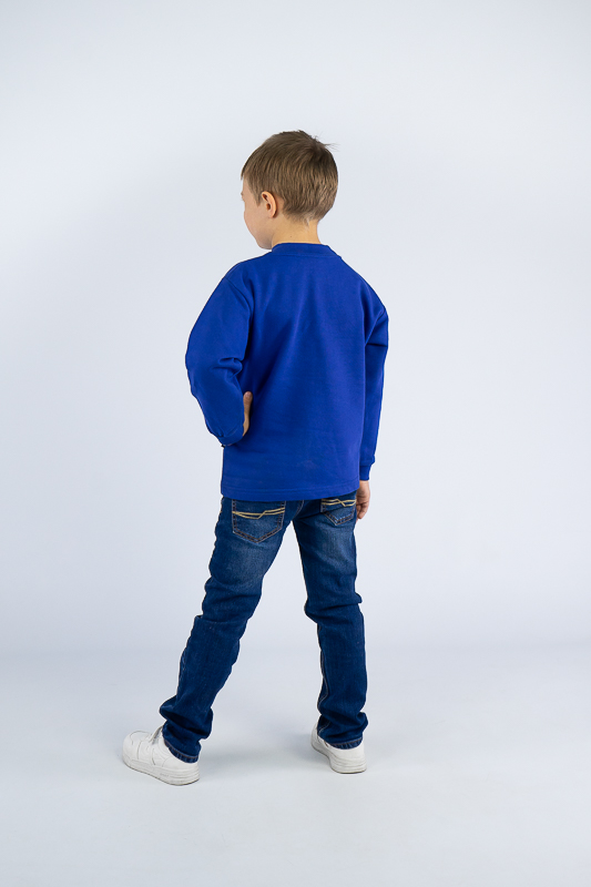 Стильний джемпер із принтом відмінно підійде хлопчикам дошкільного віку. Зрізи рукавів та горловина оброблені еластичним матеріалом. Джемпер виготовлений із трикотажного полотна – футер начіс. Лицьова сторона матеріалу гладка, схожа на кулірне переплетення, виворіт полотна має невеликий м'який ворс. Плюсами футера є висока щільність, гігроскопічність та повітропроникність. Через натуральну основу матеріал можна вважати екологічним та гіпоалергенним. Є деякі негативні моменти – матерія погано реагує на вплив прямих сонячних променів та високих температур під час прання. Тому, щоб виріб не дав усадку, прати його рекомендують за температури не вище 30-40°C. Через наявність накату прасувати виріб рекомендується з виворітного боку із застосуванням парогенератора.
