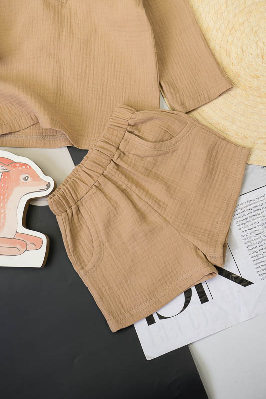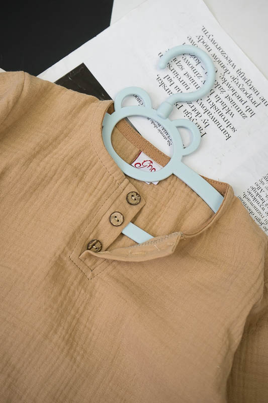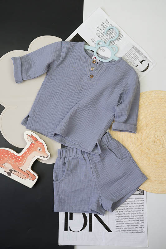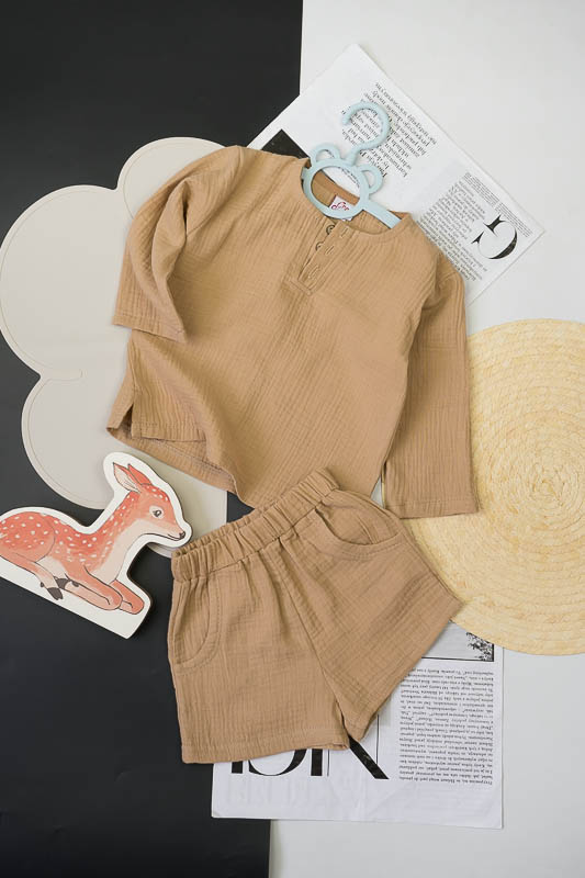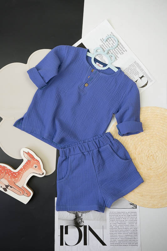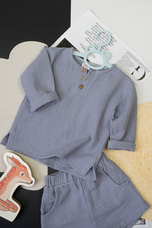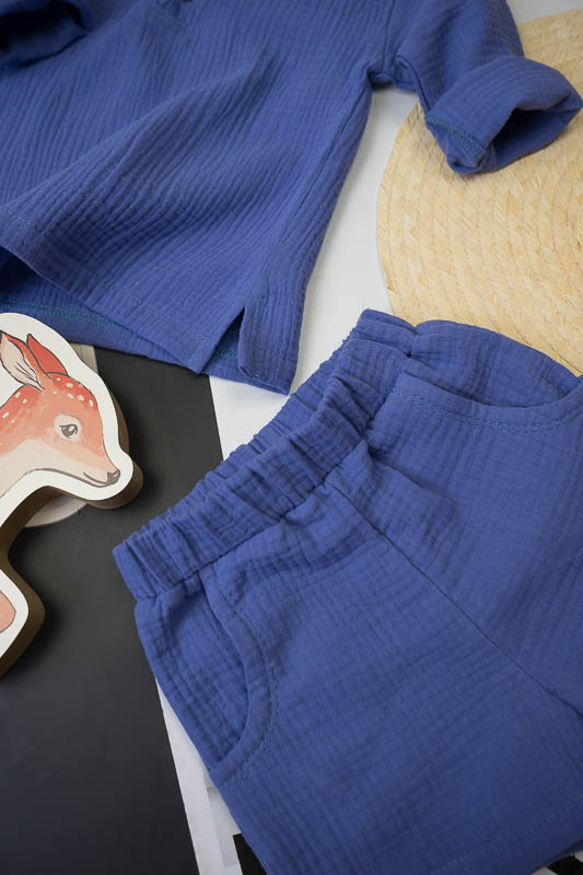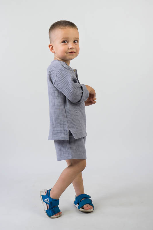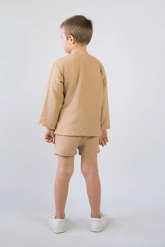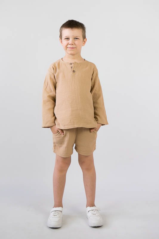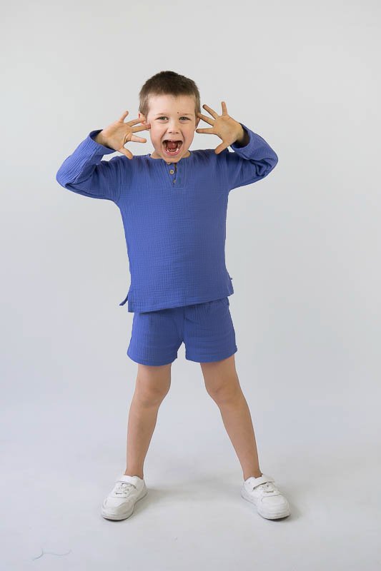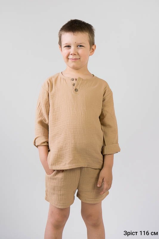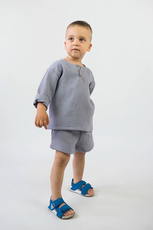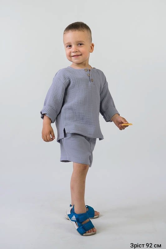 У літні спекотні дні кожна мама бажає захистити свою дитину від прямих сонячних променів. Для таких випадків ТМ «Гном» пропонує легкий та тонкий бавовняний комплект для хлопчиків, який складається з вільної сорочки та шорт. В такому одязі не спекотно та комфортно. Крім зручного крою перевагою комплекту є матеріал, з якого він виготовлений. Це муслін – бавовняна тканина, яку обирають для пошиття літнього одягу. Муслін – дуже тонка, майже прозора тканина, дуже легка та водночас міцна, добре вбирає вологу та швидко висихає, має надійний захист від ультрафіолетових променів. Щоб муслінові вироби служили вам довго та мали привабливий вигляд, за ними потрібно правильно доглядати, а саме: прати в теплій воді при температурі не більше 40°C; перед сушінням добре струснути та розправити; довго не сушити на сонці; прасувати в напівсухому вигляді з використанням пару.
