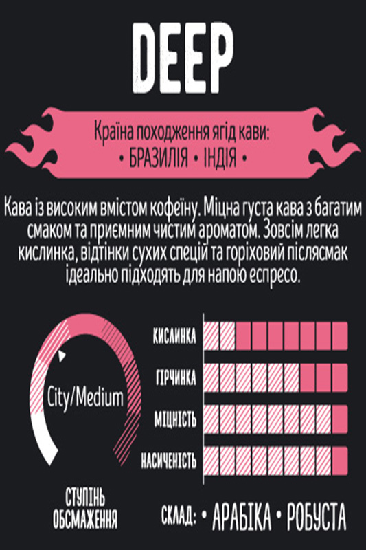 Кава із високим вмістом кофеїну. Міцна густа кава з багатим смаком та прємним чистим араматом. Зовсім легка кислинка, відтінки сухих спецій та горіховий післясмак.