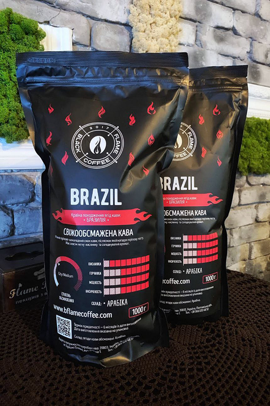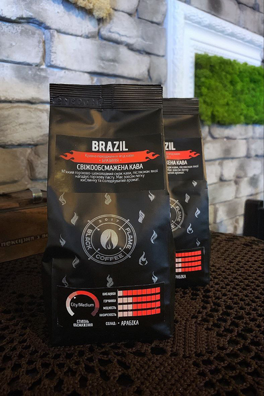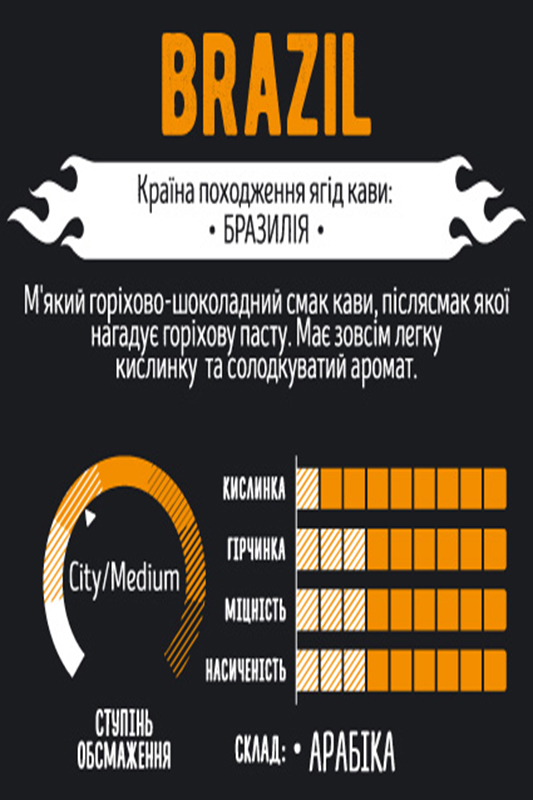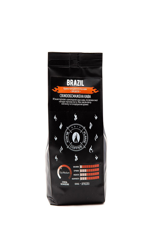 Brazil - свіжообсмажена кава. Країна походження ягід кави: "Бразилія". М'який горіхово-шоколадний смак кави, посмак якої нагадує горіхову пасту. Має зовсім легку кислинку та солодкуватий аромат.