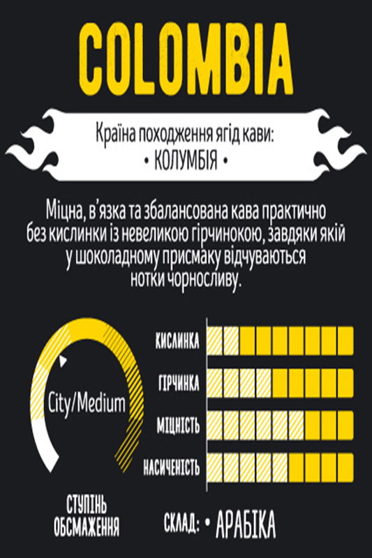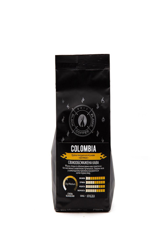 Colombia - свіжообсмажена кава. Країна походження ягід кави: "Колумбія". Колумбійська Арабіка – це класика незрівнянного кавового смаку. Напій з оксамитовим смаком, та багатим посмаком фруктового вина.