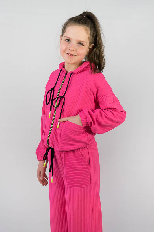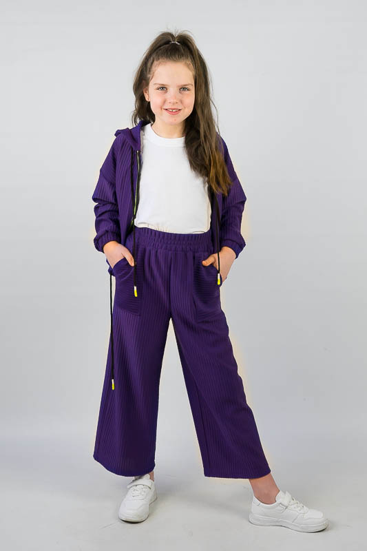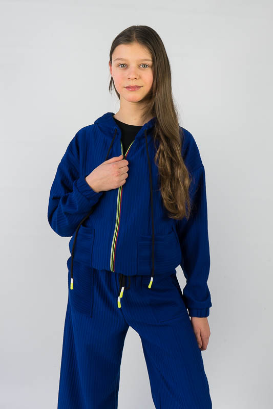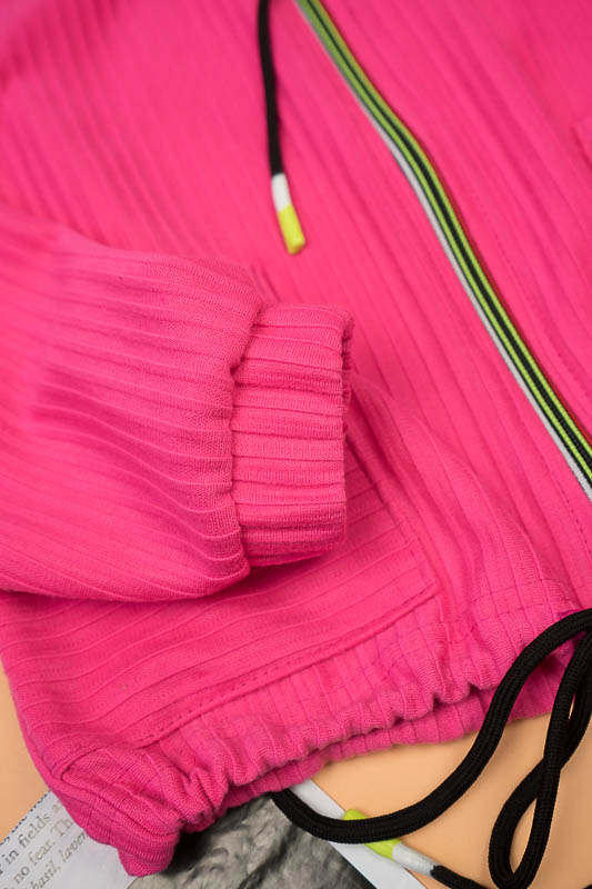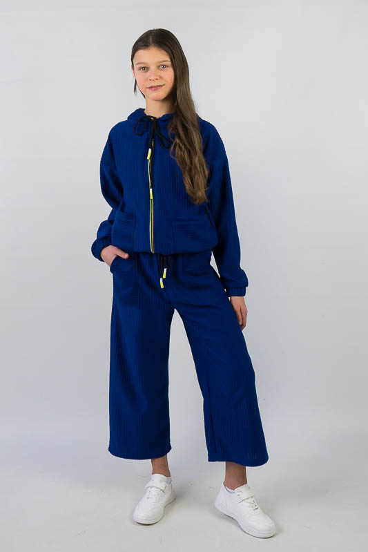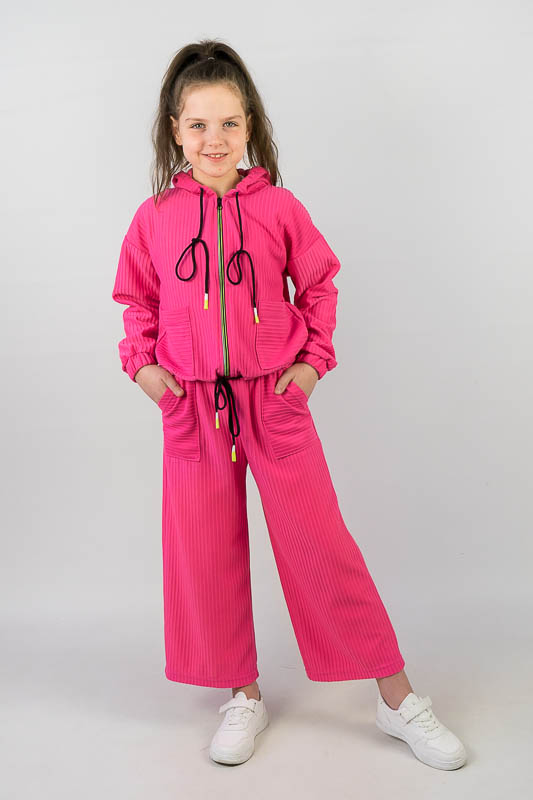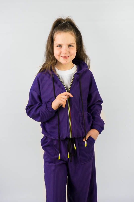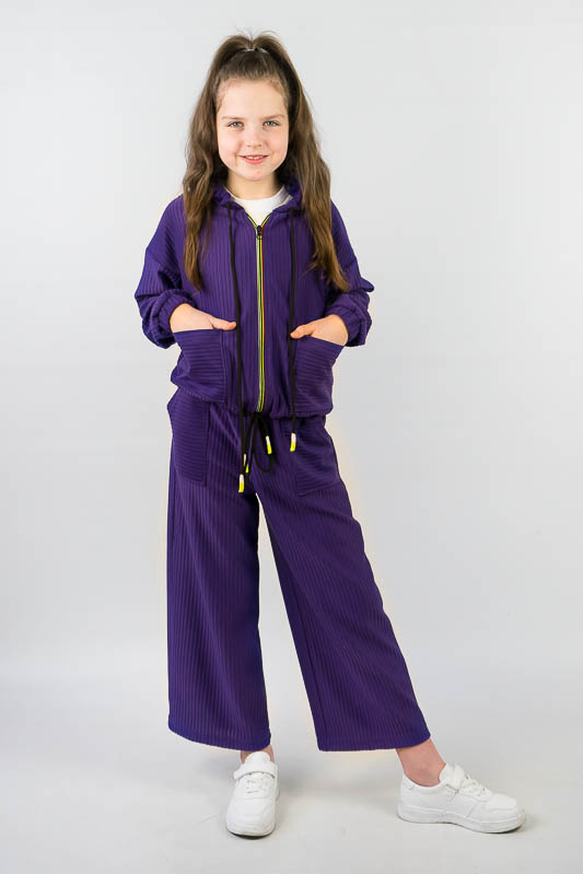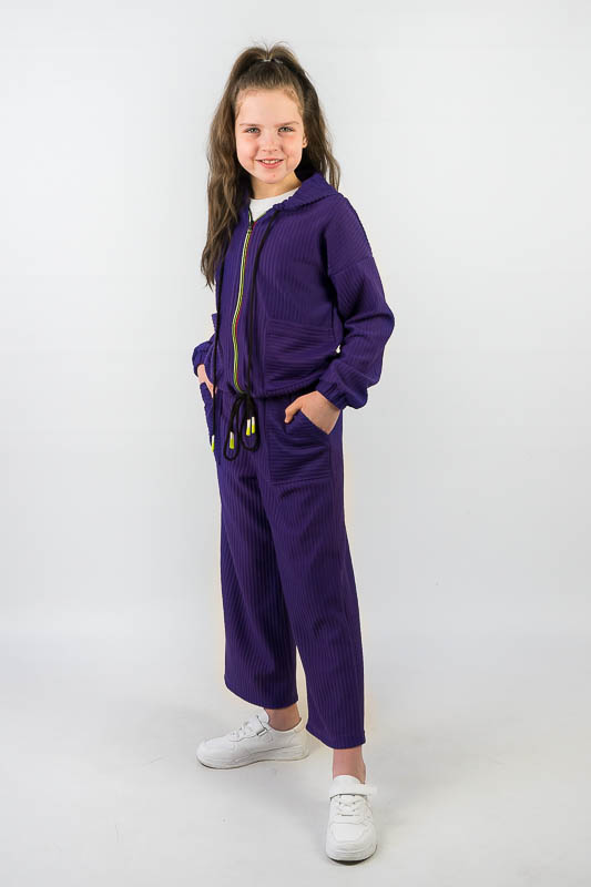 Костюм від ТМ «Гном» виготовлений для підлітків, що мають бажання виглядати стильно та неординарно. Костюм складається з бомбера з капюшоном та накладними кишенями та штанів – кюлотів, які відрізняються прямим широким кроєм та високою посадкою. Прикрашають костюм різнокольорова блискавка, та шнурки, а також структура матеріалу. Костюм виготовлений з м’якого трикотажного матеріалу – двунитка, який шляхом плетення з лицьового боку має ребристу поверхню. Це щільний піддатливий матеріал, який добре тримає форму та не витягується. Він стійкий до зносу та появи ковтунів. Невеликі пропорції еластану у складі з бавовняними та поліестеровими волокнами наділяють полотно здатністю до невеликої розтяжності. Важливо: прати при температурі не більш 30°C в «Делікатному» або «Ручному» режимі.