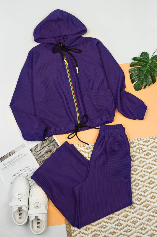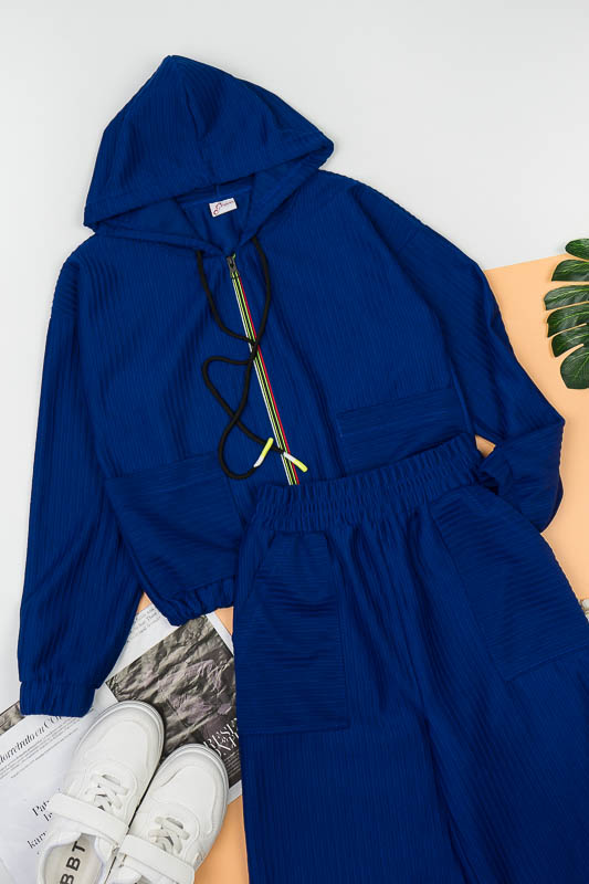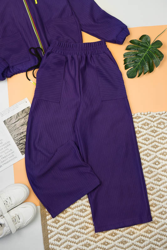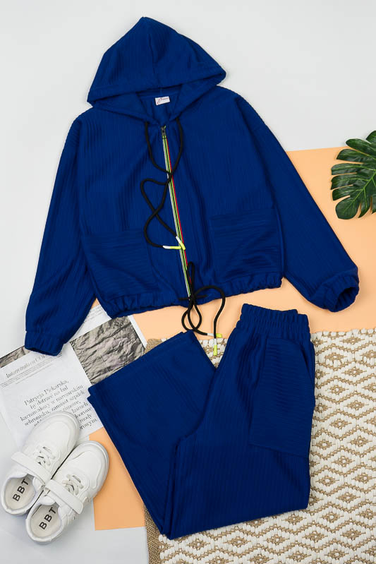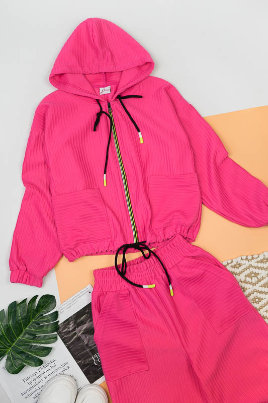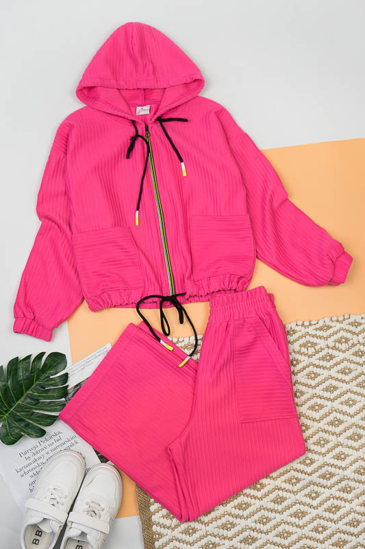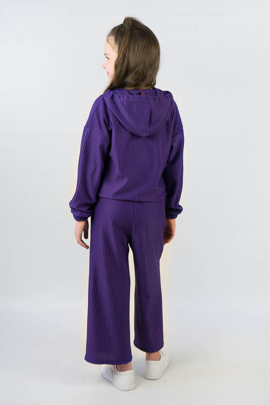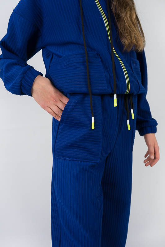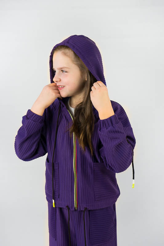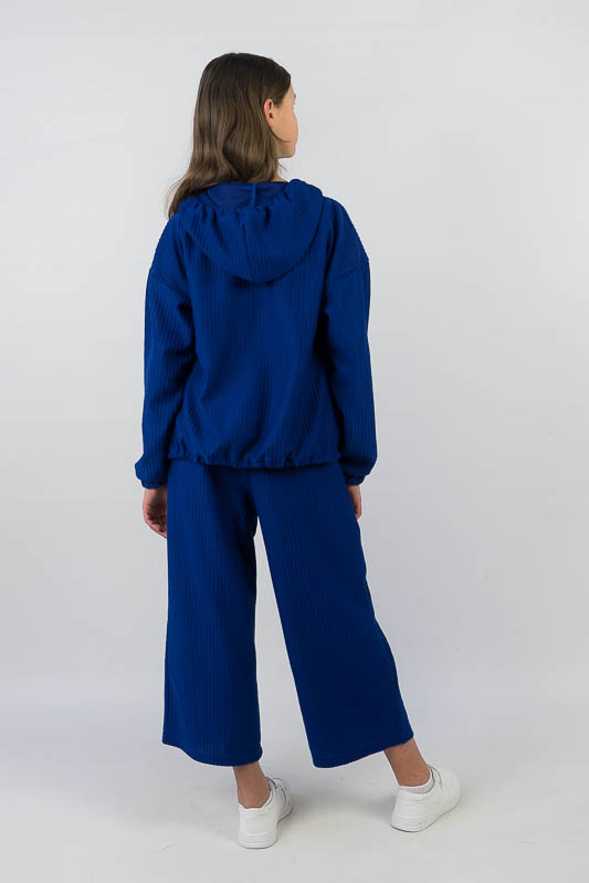 Костюм від ТМ «Гном» виготовлений для підлітків, що мають бажання виглядати стильно та неординарно. Костюм складається з бомбера з капюшоном та накладними кишенями та штанів – кюлотів, які відрізняються прямим широким кроєм та високою посадкою. Прикрашають костюм різнокольорова блискавка, та шнурки, а також структура матеріалу. Костюм виготовлений з м’якого трикотажного матеріалу – двунитка, який шляхом плетення з лицьового боку має ребристу поверхню. Це щільний піддатливий матеріал, який добре тримає форму та не витягується. Він стійкий до зносу та появи ковтунів. Невеликі пропорції еластану у складі з бавовняними та поліестеровими волокнами наділяють полотно здатністю до невеликої розтяжності. Важливо: прати при температурі не більш 30°C в «Делікатному» або «Ручному» режимі.