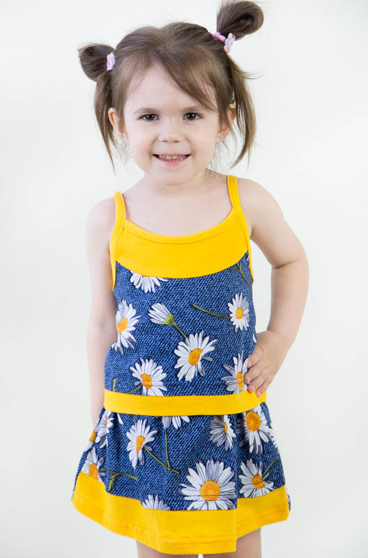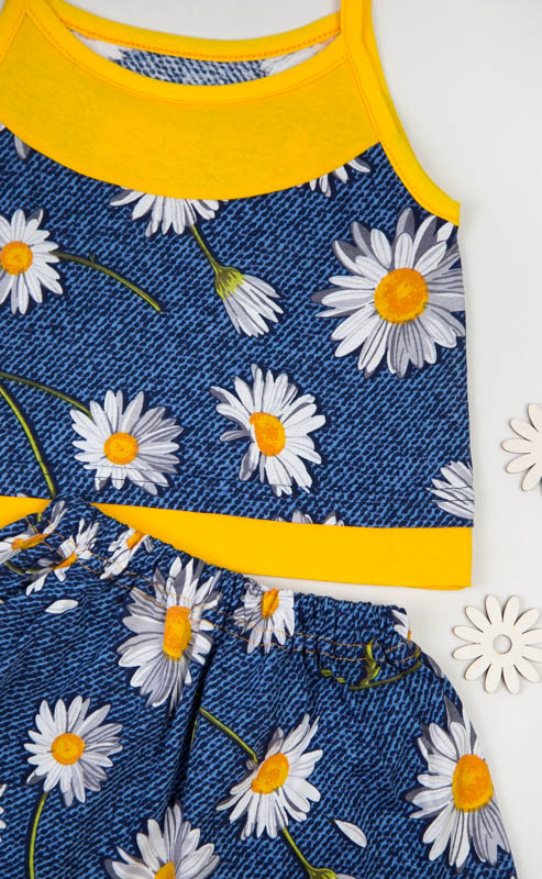 Комплект пошитий з трикотажного полотна - реактив-кулір. Реактив - легка і еластична бавовняна тканина із зображенням, нанесеним, методом реактивного фарбування. Зазвичай не сильно тягнеться. В цей комплект входить топ і спідниця. Топ складається з двох основних частин, а попереду є кокетка однотонного кольору. Спідниця так само складається з основних двох частин і має внизу кокетку.