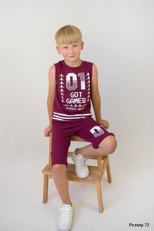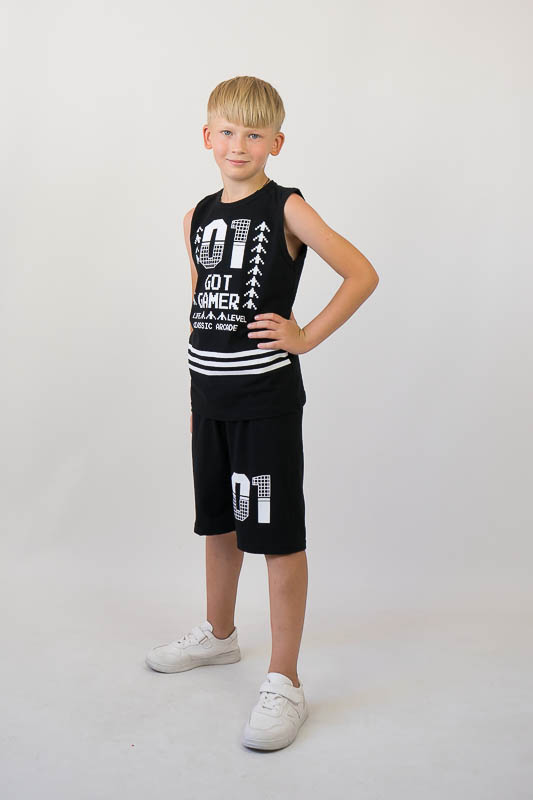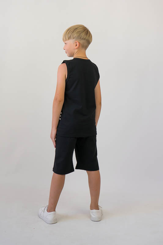 Новинка сезону - комплект для хлопчиків в стилі «Sports Street». Комплект виконаний з полотна кулір- це 100% бавовна. Гладкість і м'якість поверхні робить виріб приємним до тіла. Гігроскопічність і повітропроникність забезпечує нормальну терморегуляцію тіла і не створює дискомфорту в жарку пору року. Модель складається з безрукавки і шортів. Горловина і пройми оброблені бейкою з такого ж полотна, шорти безшовні з боків, а в пояс вшита резинка шириною в 2 см. Модний білий накат прикрашає перед безрукавки і шорти. Такий комплект буде зручним і комфортним для занять спортом і відпочинком. Розрахований комплект на хлопчиків від 6 до 11 років.