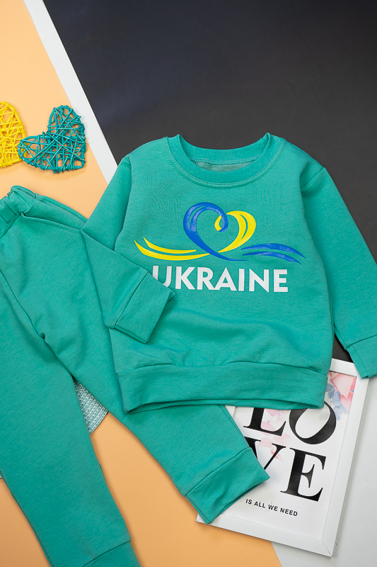 Зручний та яскравий костюм виготовлений для дітей дошкільного віку. Класична однотонна модель прикрашена яскравим принтом. Горловина оброблена еластичним матеріалом, а зрізи рукавів та низ моделі матеріалом основного кольору. Виготовлений костюм з трикотажного полотна – двунитка. Трикотаж має позитивні споживчі якості, а саме: добре вбирає вологу, ефективно пропускає повітря, має високу теплоощадну здатність, не утворює пилок (ковтунів), не витягується при носінні, простий у догляді. Рекомендується прати в «Делікатному» або «Ручному» режимі при температурі не вище 40°C, прасувати з виворотної сторони.