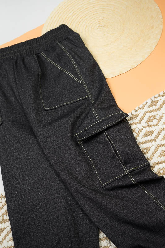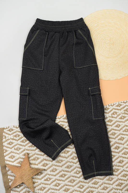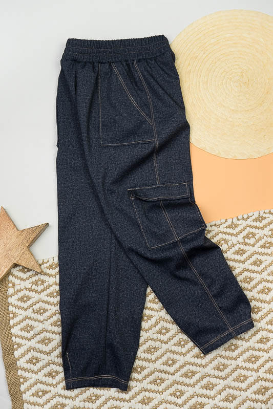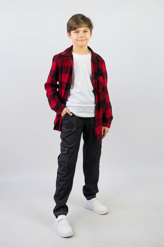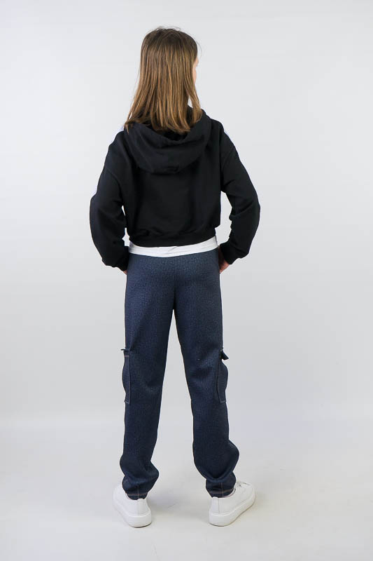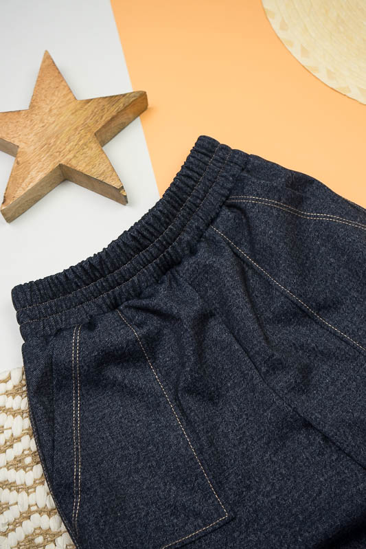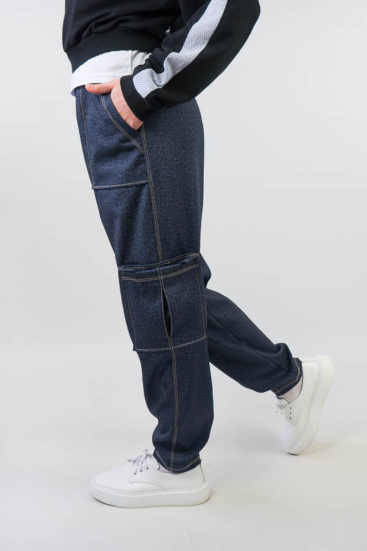 Класична форма штанів – бананів має широку верхню частину, яка стрімко звужується до низу. Така модель практична і комфортна та підходить для повсякденного носіння. Штани – банани від ТМ «Гном» мають високу посадку, призібраний пояс та модні накладні кишені. Щільний еластичний матеріал з джинсовим принтом оброблений оздоблювальними швами, що додає стильного вигляду. Модель виготовлена з трикотажного матеріалу – Алекс, в складі якого є натуральні волокна (бавовна, віскоза) та синтетичні (поліестер). Така суміш ниток забезпечує готовому матеріалу високий рівень міцності, щільності, а також приємне тактильне відчуття на тілі. Матеріал гігроскопічний, повітропроникний, протиалергенний. Алекс досить простий у догляді: прання руками або в пральній машині при температурі води не більше 30°C, можна не прасувати.