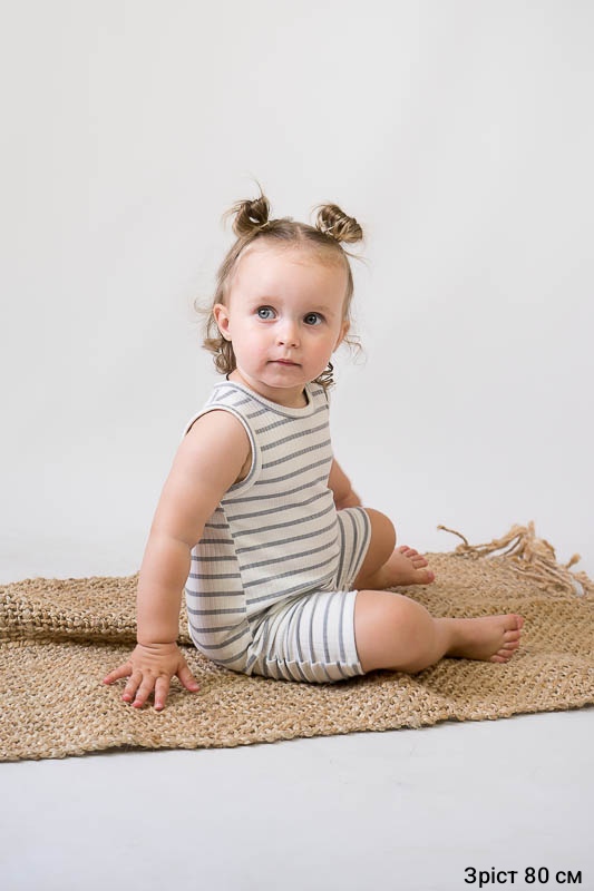 ТМ «Гном» пропонує стильний і комфортний літній комбінезон для самих маленьких, в якому ваша крихітка буде відчувати себе легко і зручно. Вільний крій не обмежує рухи, по плечу та між ніжок знаходяться застібки - кнопки, які дають можливість швидко і без проблем переодягнути малюка або поміняти підгузок. Модель виготовлена зі смугастого полотна у рубчик - мустанг. Завдяки еластичності та м’якості матеріалу, виріб не сковує рухів та створює комфорт і зручність. Матеріал приємний до тіла, не викликає подразнень та алергії. Прати вручну у воді не більше 30°C, сильно не віджимати, прасувати не обов’язково.