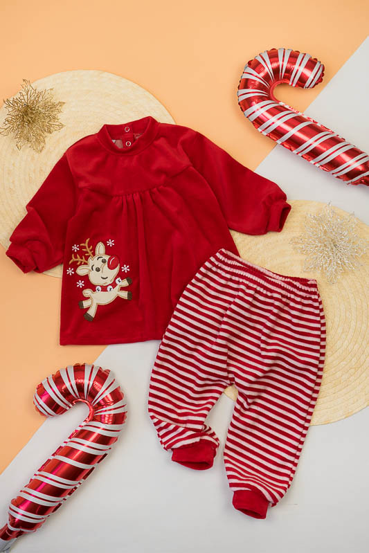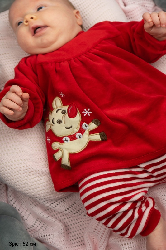 Яскравий комплект для дівчинки від ТМ «Гном» ідеально підійде для зустрічі зимових свят та для першої різдвяної фотосесії. Комплект складається з червоної сукні та смугастих штанців. Сукня прикрашена вишивкою "Різдвяного Оленя". На спинці для зручності знаходиться застібка кнопки. Модель виготовлена з велюру на бавовняній основі. Це щільний, але при цьому м’який матеріал. Не мнеться, не розтягується та не потребує складного догляду. Рекомендований догляд - прання вручну або в пральній машині при температурі не вище 30-40°C в «Делікатному» або «Ручному» режимі. Віджимання повинно бути легким на мінімальній кількості оборотів. Для сушіння рекомендується горизонтальна поверхня далеко від сонячних променів. Прасування тільки з виворітного боку.