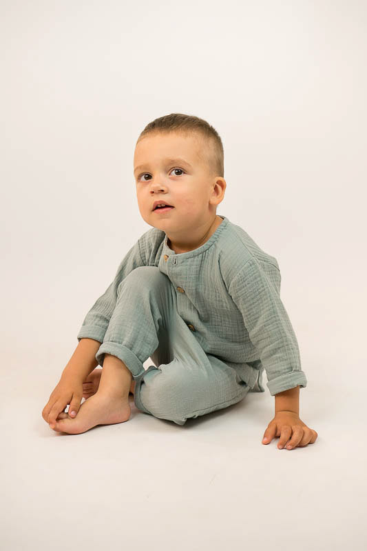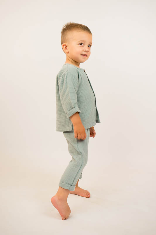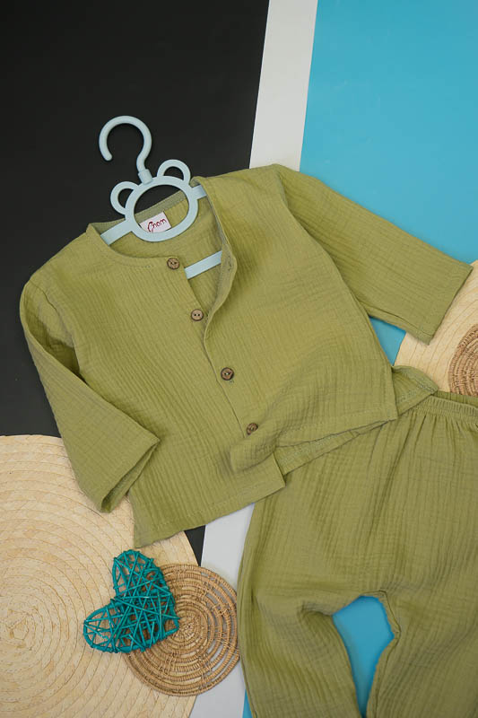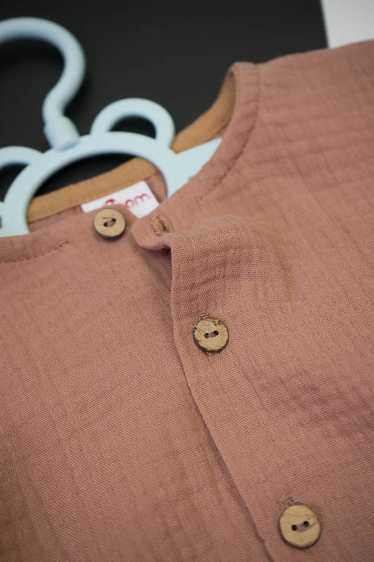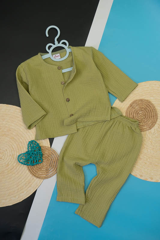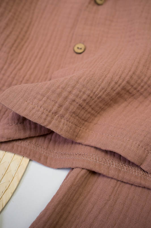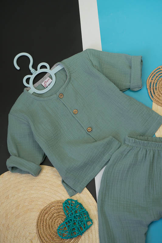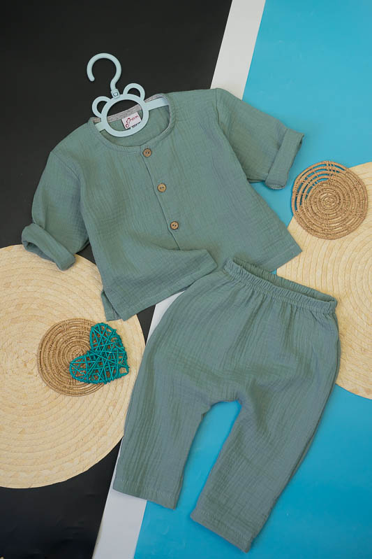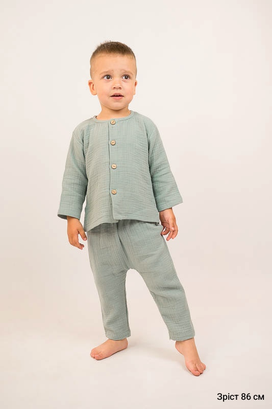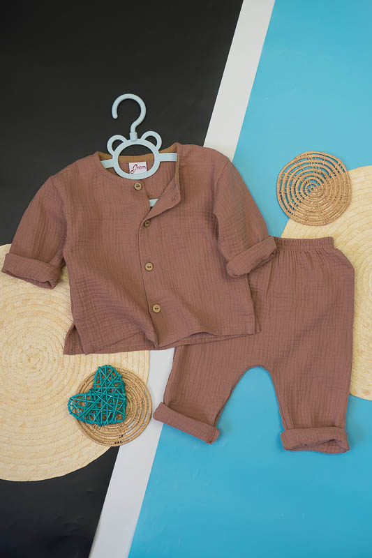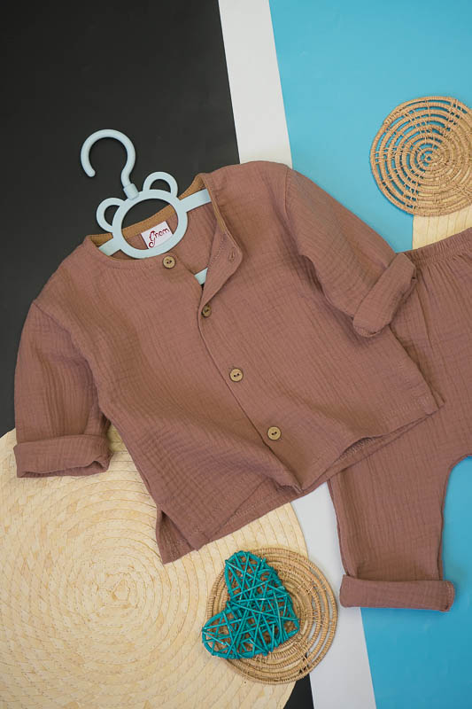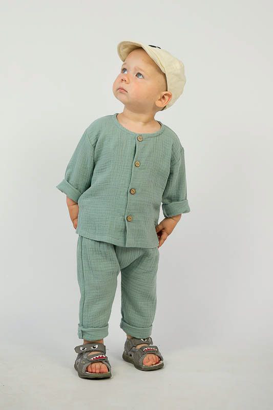 У літні спекотні дні кожна мама бажає захистити свою дитину від прямих сонячних променів. Для таких випадків ТМ «Гном» пропонує легкий та тонкий бавовняний комплект для самих маленьких хлопчиків, який складається з вільної сорочки на ґудзиках та штанів. В такому одязі не спекотно та комфортно. Крім зручного крою перевагою комплекту є матеріал, з якого він виготовлений. Це муслін – бавовняна тканина, яку обирають для пошиття літнього одягу. Муслін – дуже тонка, майже прозора тканина, дуже легка та водночас міцна, добре вбирає вологу та швидко висихає, має надійний захист від ультрафіолетових променів. Щоб муслінові вироби служили вам довго та мали привабливий вигляд, за ними потрібно правильно доглядати, а саме: прати в теплій воді при температурі не більше 40 °C; перед сушінням добре струснути та розправити; довго не сушити на сонці; прасувати в напівсухому вигляді з використанням пару.