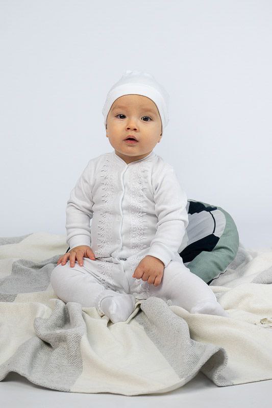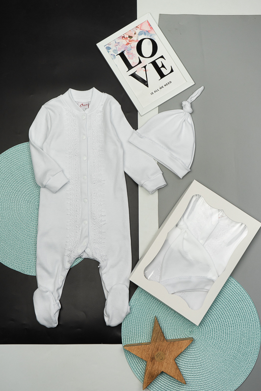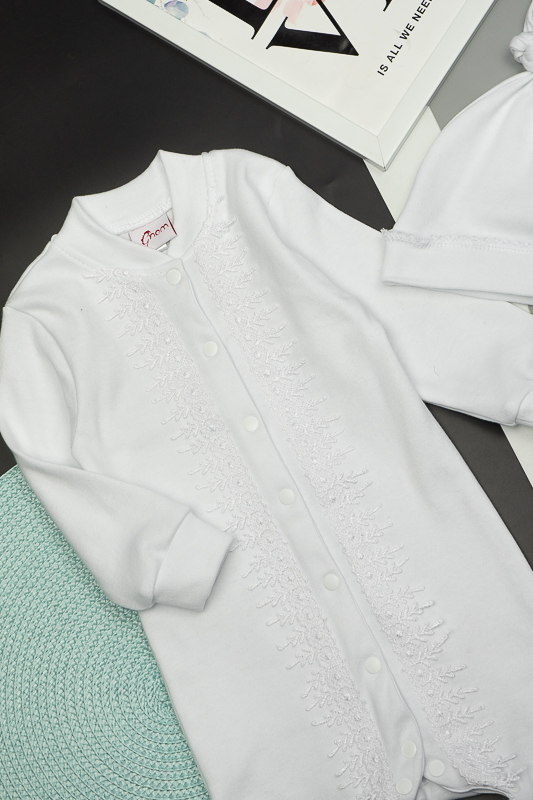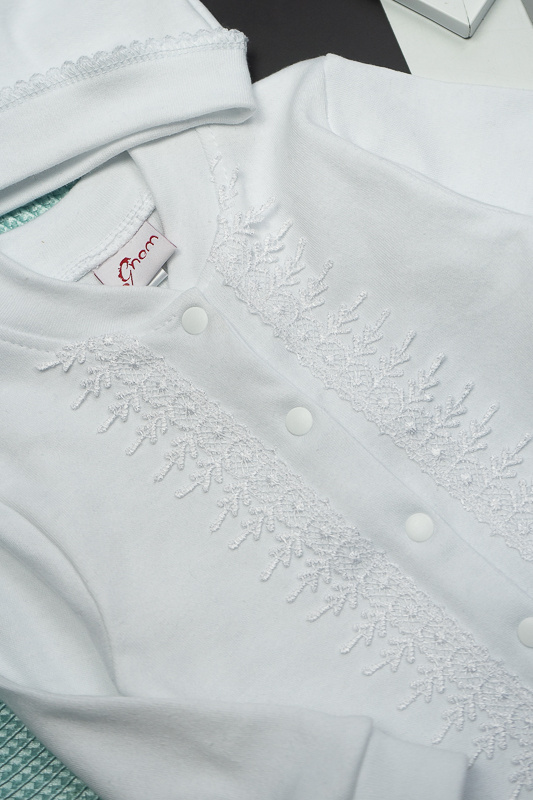 У цьому ніжному комплекті від ТМ «Гном» ваш малюк виглядатиме мило та ошатно. Такий комплект, що складається з комбінезона та шапочки, чудово підійде як на виписку з пологового будинку, так і на хрестини. Комбінезон по довжині прикрашений широким мереживом. Для зручності застібкою служать кнопки, які проходять по всій довжині виробу і між ніжками. Довжину шапочки можна відрегулювати вузликом. Комплект виготовлений з щільного і приємного на дотик трикотажного матеріалу - інтерлок, який складається з бавовняного натурального волокна. Полотно еластичне (зберігає форму навіть при сильному розтягуванні), міцне, стійке до зносу, екологічне (не викликає алергію навіть у маленьких дітей, добре пропускає повітря, дозволяє шкірі дихати). Однак потрібно бути акуратним при пранні, а особливо з температурою води. Не дотримання правильного режиму може спричинити усадку. Рекомендований догляд за виробом: ручне або машинне прання на малих обертах при температурі не вище 30°C із застосуванням м'якого миючого засобу, прасування при невисокій температурі з виворітного боку. До комбінезона додається подарункова коробка.