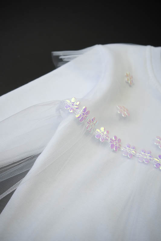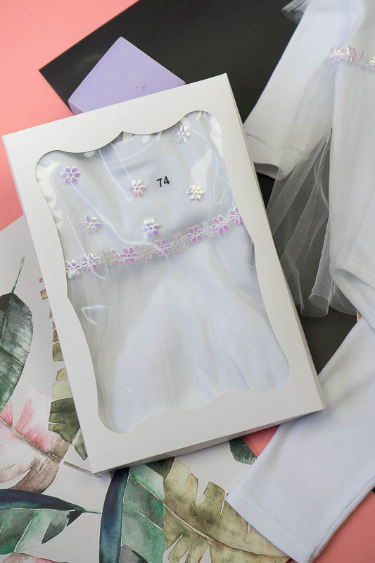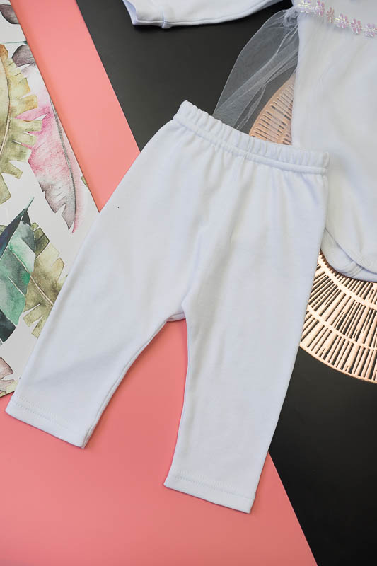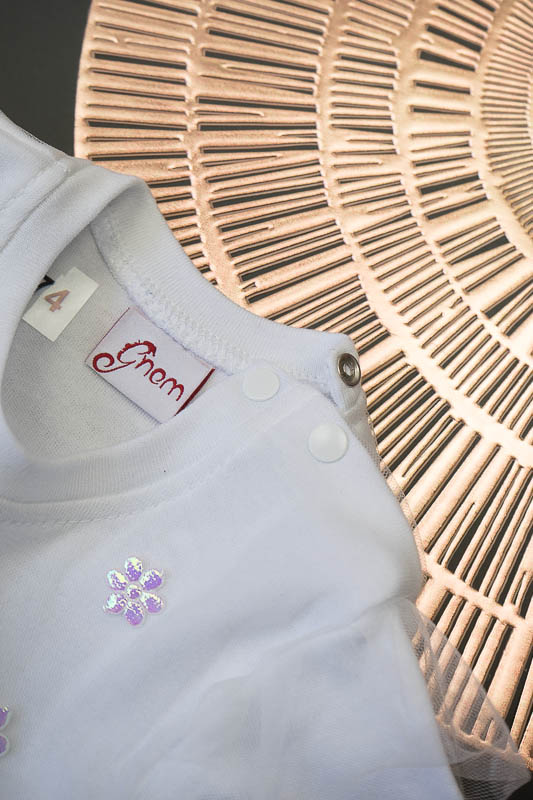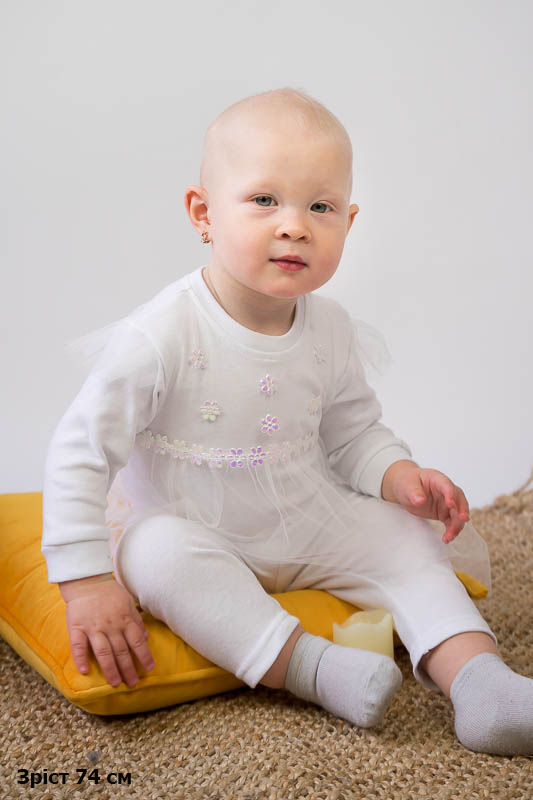 Ніжний білий комплект від ТМ «Гном» призначений для самих маленьких дівчаток і відмінно підійде як на виписку з пологового будинку, так і на хрестини. Складається комплект з боді та штанців. Боді має легку фатинову спідничку та прикрашена перламутровими квіточками. Комплект виготовлений з щільного і приємного на дотик трикотажного матеріалу - інтерлок, який складається з бавовняного натурального волокна. Полотно еластичне (зберігає форму навіть при сильному розтягуванні), міцне, стійке до зносу, екологічне (не викликає алергію навіть у маленьких дітей, добре пропускає повітря, дозволяє шкірі дихати). Однак потрібно бути акуратним при пранні, а особливо з температурою води. Не дотримання правильного режиму може спричинити усадку. Рекомендований догляд за виробом: ручне або машинне прання на малих обертах при температурі не вище 30 °C із застосуванням м'якого миючого засобу, прасування при невисокій температурі з виворітного боку. До комплекту додається подарункова коробка.