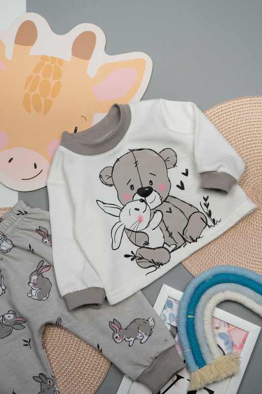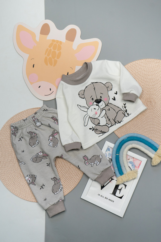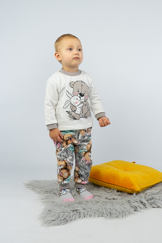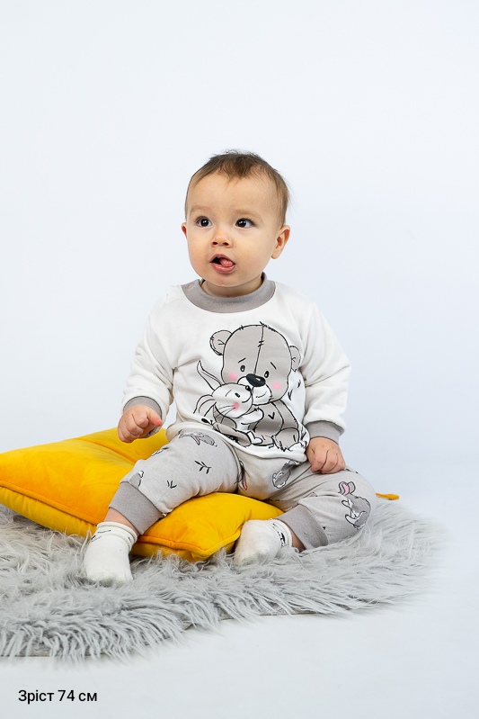 Затишна піжама від ТМ «Гном» для малюків відмінно підійде і як домашній одяг, і як одяг для сну. Складається костюм з кофтини та штанів. Вільний крій, м’які манжети та зручна застібка на плечі дають змогу почуватися зручно і комфортно. Передню частини кофти прикрашає яскравий малюнок. Модель виготовлена з трикотажного полотна - начісний футер. У цього полотна лицьова сторона гладка, а виворітна з м'яким щільним начосом. Начос досить міцний, тому витримає будь-які навантаження, навіть самі інтенсивні рухи не викличуть зламів або складок на речах. Полотно стійке до появи затягувань і ковтунів. Вироби з такого матеріалу зручні та практичні. Однак є деякі негативні моменти - матерія погано реагує на вплив прямих сонячних променів і високих температур при пранні. Тому, щоб виріб не дав усадку, прати його рекомендують при температурі не вище 30-40°C.