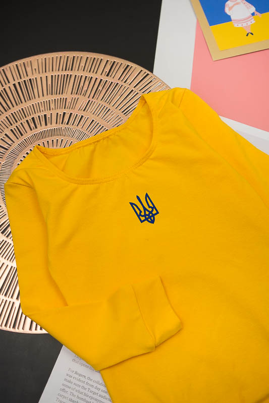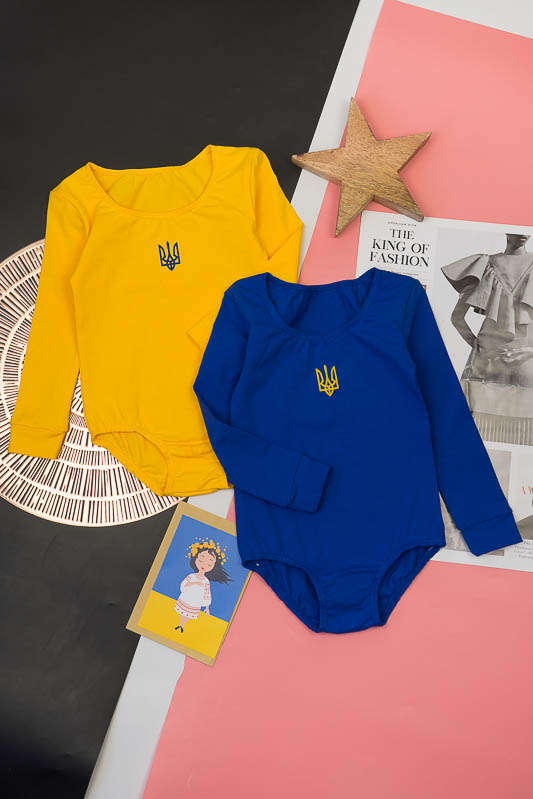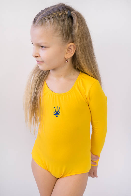 Спортивний тренувальний купальник від ТМ «Гном» з довгим рукавом призначений для гімнастики та інших спортивних занять. Модель виготовлена в патріотичних тонах та прикрашена малюнком «Тризуба». Виготовлений зі стрейч-куліру - еластичного і приємного до тіла полотна, до складу якого входить 95% бавовни та 5% лайкри, що допомагає полотну не витягуватися і зберігати форму після численних прань. Кулір володіє хорошою гігроскопічністю, не викликає алергію, що відмінно підходить для фізичної активності. Виріб невибагливо у догляді, його можна прати при температурі до 40°C в делікатному або ручному режимі, не використовувати відбілювачі або порошки з відбілювачами.