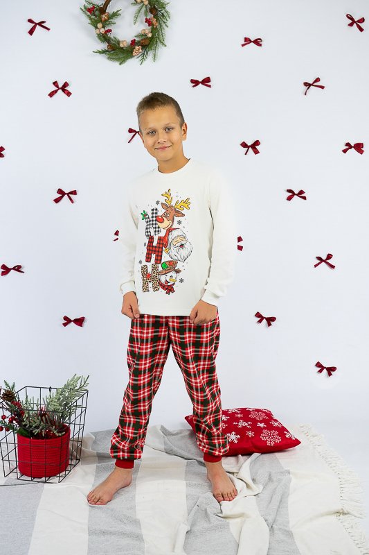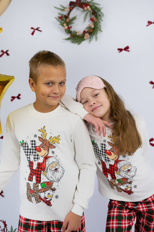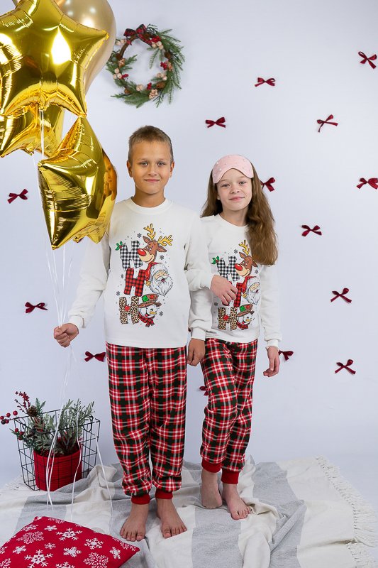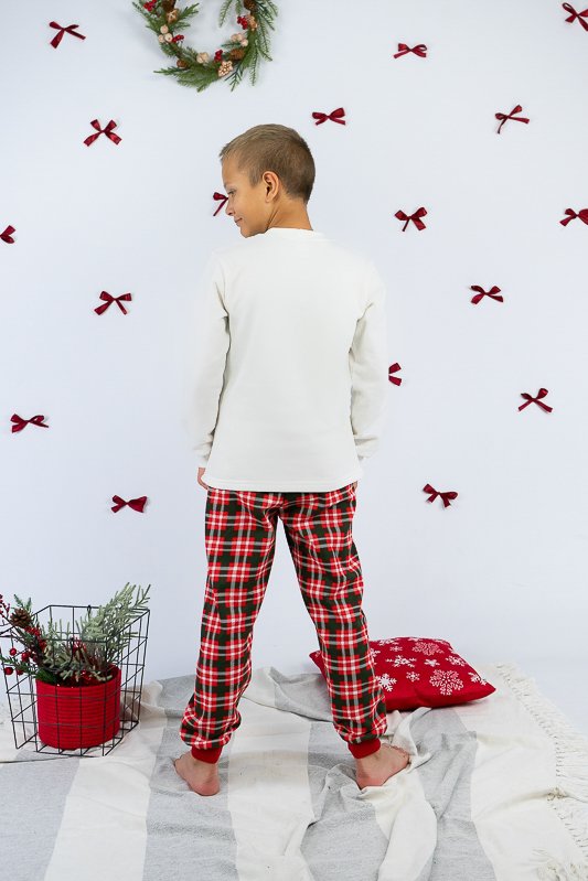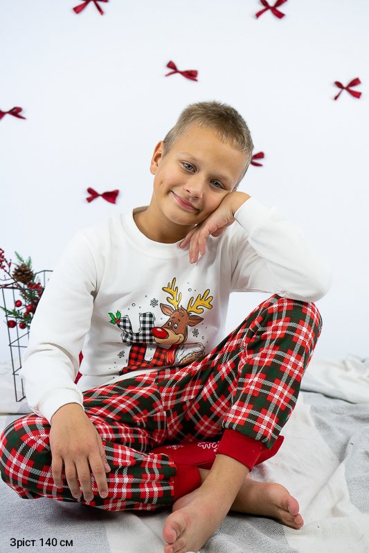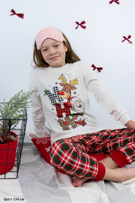 Тепла піжама із колекції "Family look" виготовлена для дітей від 8 до 13-14 років. Вона м’яка та комфортна, що сприяє повноцінному відпочинку та приємному сну вашої дитини. Вільний крій та обробка зрізів рукавів і ніжок еластичними манжетами забезпечать комфорт та зручність. Поєднання однотонного та принтованого в клітинку трикотажного полотна з додаванням яскравого малюнку створять приємний святковий настрій. Сімейну колекцію доповнять моделі арт. 150-300-1267Ж-1, 150-300-1267Ч-1 та 300-1267Д-1. Виготовлена піжама із начісного футера – матеріалу теплого та комфортного. Лицьова сторона такого полотна гладка і приємна, а з виворітного боку - теплий і м'який начос. Начос досить міцний, тому витримає будь-які навантаження, навіть найінтенсивніші рухи не викличуть зламів або складок на речах. Полотно стійке до появи затяжок та ковтунів. Вироби з такого матеріалу зручні, практичні та прослужать Вам дуже довго. Однак є деякі негативні моменти – матерія погано реагує на вплив прямих сонячних променів та високих температур під час прання. Тому, щоб виріб не дав усадку, прати його рекомендують за температури не вище 30°C. Прасувати треба з лицьової сторони.