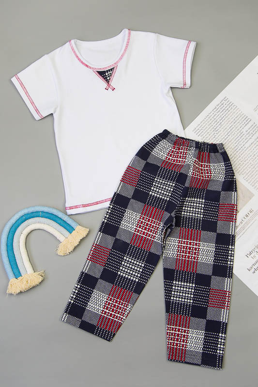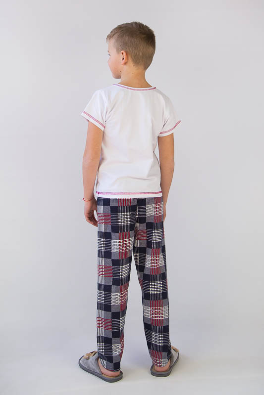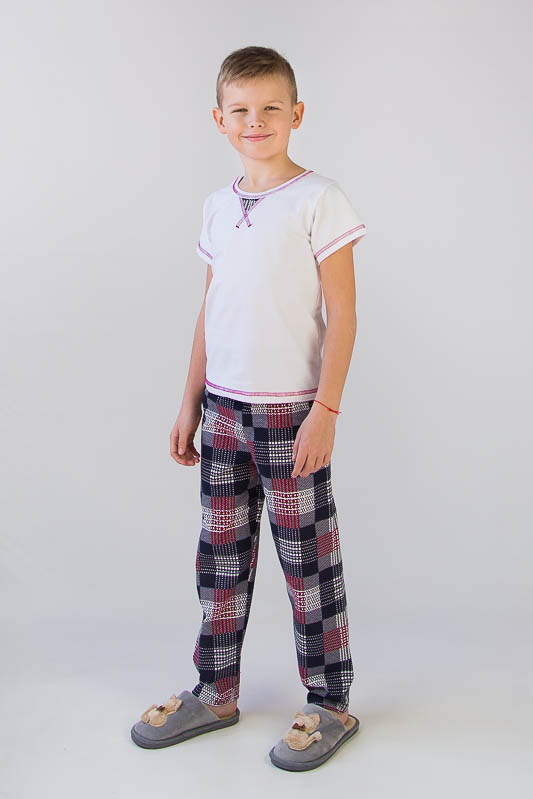 Дитяча піжама має бути не тільки зручною та вільною, але й цікавою для дитини. ТМ «Гном» пропонує практичний варіант легкої піжами для хлопчиків дошкільного та молодшого шкільного віку, що складається з футболки та штанів. Горловина футболки оформлена оздоблювальною вставкою із картатого матеріалу штанів. Модель виготовлена із комбінації трикотажних кулірних полотен. Сировиною куліру служить 100% бавовна. Однак у матеріалі футболки є лайкра, що робить полотно більш стрейчовим. Це сприяє матеріалу не витягуватися і зберігати форму після численних праннів. До переваг куліра варто віднести такі параметри як екологічність, гіпоалергенність, мале зминання. Особливості догляду за піжамою - це ручне прання або машинне в делікатному режимі при температурі 30-40°С; віджимання в пральній машині дозволено на мінімальних оборотах; прасувати вироби на 1 температурному режимі для збереження кольору.