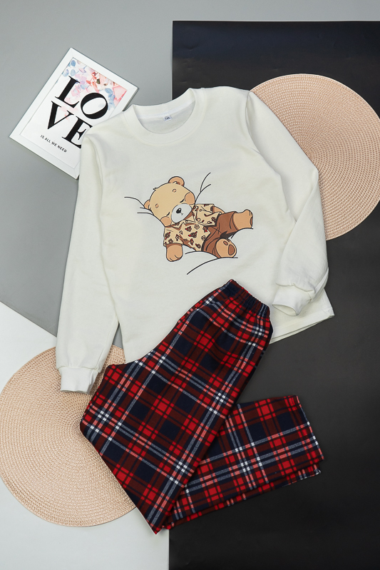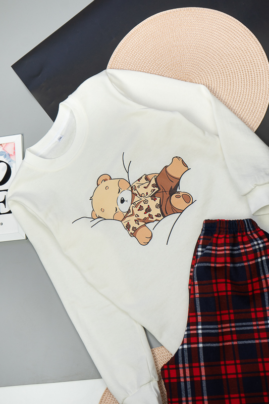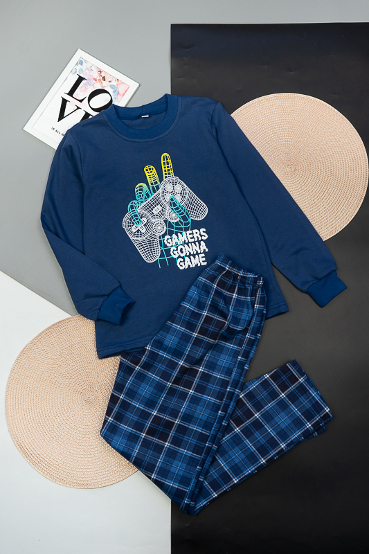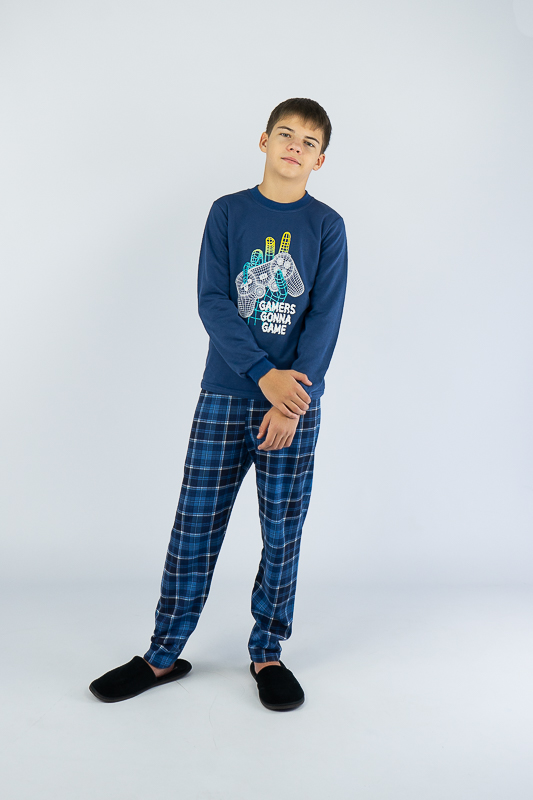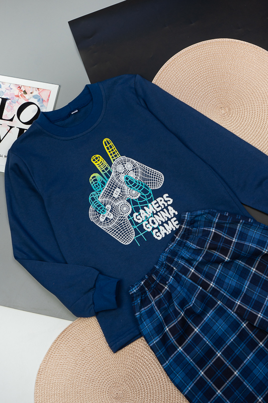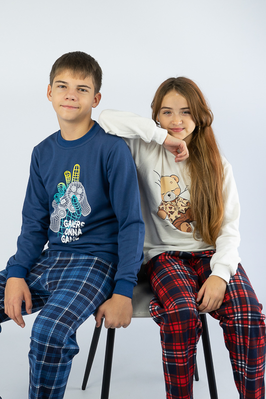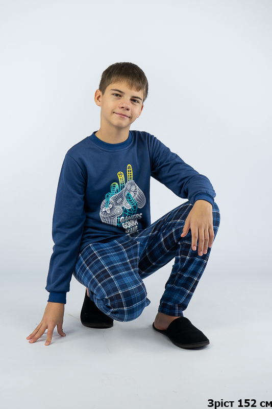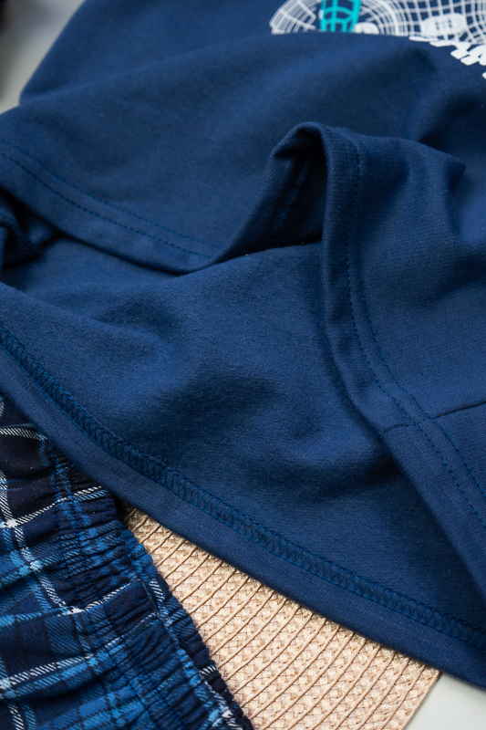 Приємна та затишна піжама від ТМ «Гном» виготовлена для дітей підліткового віку. Барвистий малюнок оздоблює передню частину кофтинки та відмінно поєднується зі штанами у клітинку. Комфортний, легкий матеріал та вільний крій сприяють повноцінному відпочинку та приємному сну. Піжама виготовлена з трикотажного полотна – начісного футера, основою якого є 100% бавовна. Лицьова сторона матеріалу гладка, схожа на кулірне переплетення, виворіт полотна має невеликий м'який ворс. Плюсами футера є висока щільність, гігроскопічність та повітропроникність. Через натуральну основу матеріал можна вважати екологічним та гіпоалергенним. Є деякі негативні моменти – матерія погано реагує на вплив прямих сонячних променів та високих температур під час прання. Тому, щоб виріб не дав усадку, прати його рекомендують за температури не вище 30-40°C.