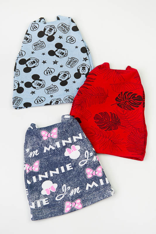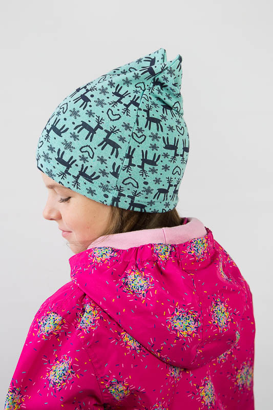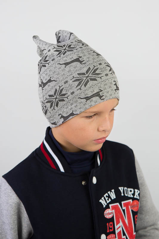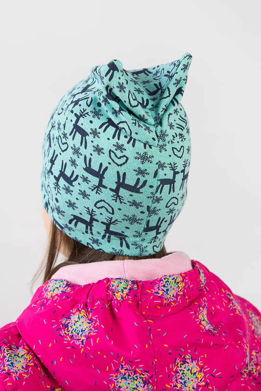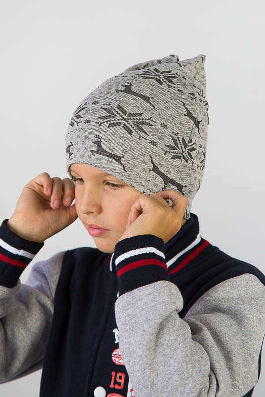 Дитяча шапка пошита з еластичного трикотажного полотна стрейч-футер, яке має вив'язану фактуру англійської гумки. Застосовується для виготовлення верхнього трикотажу. Полотно має високу розтяжністю, при пранні не линяє, не сідає і дуже добре тримає форму. Шапка прямого силуету, низ якої прошитий швом в подгибку, з зворотньої сторони подвійна призборка. Така шапка буде зручна в повсякденному носінні в прохолодну погоду.