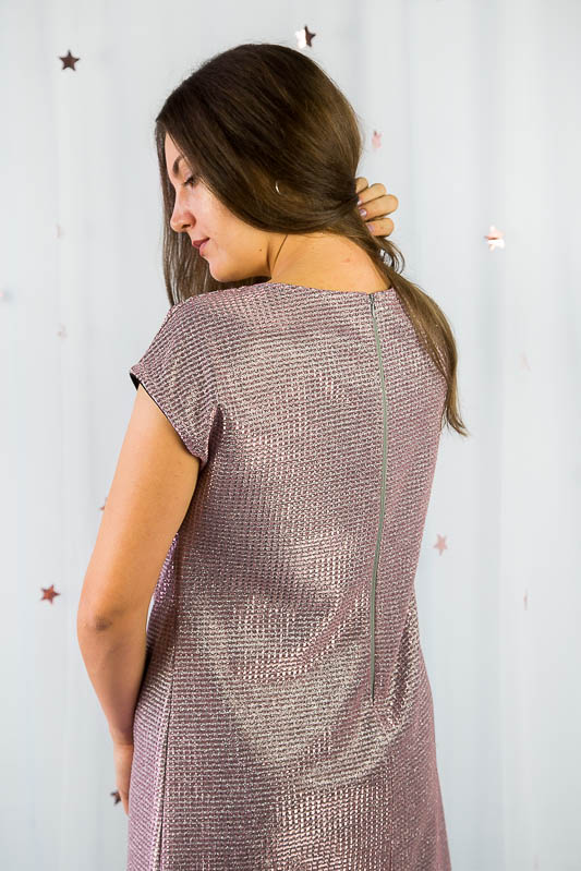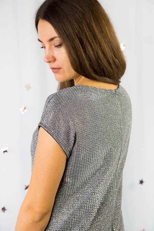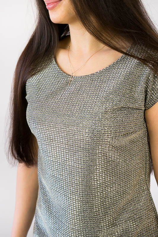 Розкішна коктейльна сукня від ТМ «Гном» дозволить блиснути на будь-якому святковому заході в буквальному значенні цього слова. Модель напівприлеглого силуету зі спущеним плечем добре промальовується силует і не створює зайвого об'єму, а пікантна довжина дозволяє продемонструвати красу ніжок. Простий крій вдало поєднується з красою та блиском матеріалу, що дозволить його володарці бути чарівною. Для зручності по спинці виробу вшита блискавка. Сукня виготовлена із трикотажу «Диско». Склад матеріалу – це 95% поліестеру та 5% еластану. Лицьова сторона полотна має блискуче покриття, що імітує паєтки. Виворітний бік виглядає як звичайна однотонна м'яка трикотажна поверхня. Ця якість дає право у пошитті не використовувати підкладковий матеріал. Полотно не мнеться, відрізняється міцністю, зносостійкістю та еластичністю. Використовується трикотаж «Диско» для пошиття коктейльних суконь, блуз, спідниць, що облягають. За виробом рекомендується делікатний догляд: ручне прання при температурі не більше 30°С, прасування тільки з виворітного боку в режимі «Шовк» або «Синтетика».