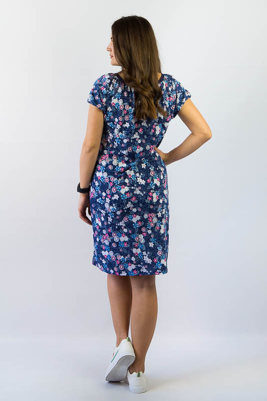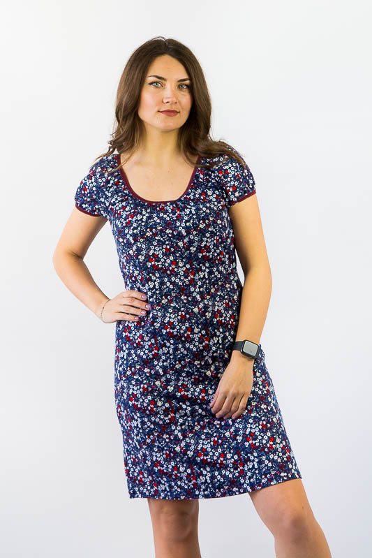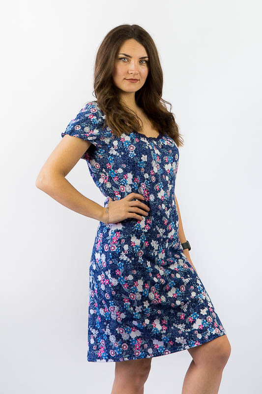 Шанувальниці вишуканої простоти крою не залишаться байдужі до милої і жіночної сукні полуприлеглого силуету. М'які форми, присбірка в області грудей, рукав «Ліхтарик» в поєднанні з принтом в дрібну квіточку створюють романтичний образ, а комфортний трикотажний матеріал з хорошою еластичністю додасть легкість і свободу рухів. Виготовлений виріб з тонкого віскозного трикотажного полотна. Завдяки натуральній сировини віскози, виріб має масу переваг: дарує відчуття прохолоди в жарку погоду, добре пропускає повітря і вбирає вологу, не викликає алергію. Рекомендований догляд за сукнею - це ручне прання або машинне на малих обертах при температурі не вище 40 градусів із застосуванням м'якого миючого засобу, прасування виконують при невисокій температурі.