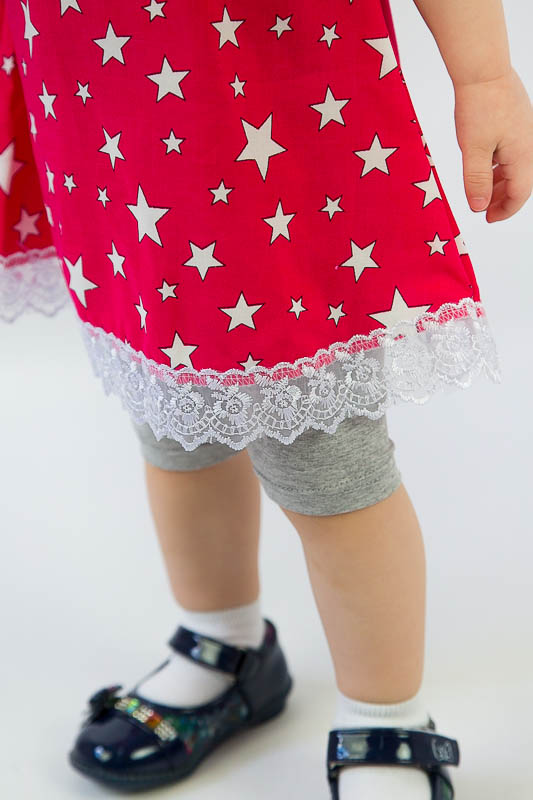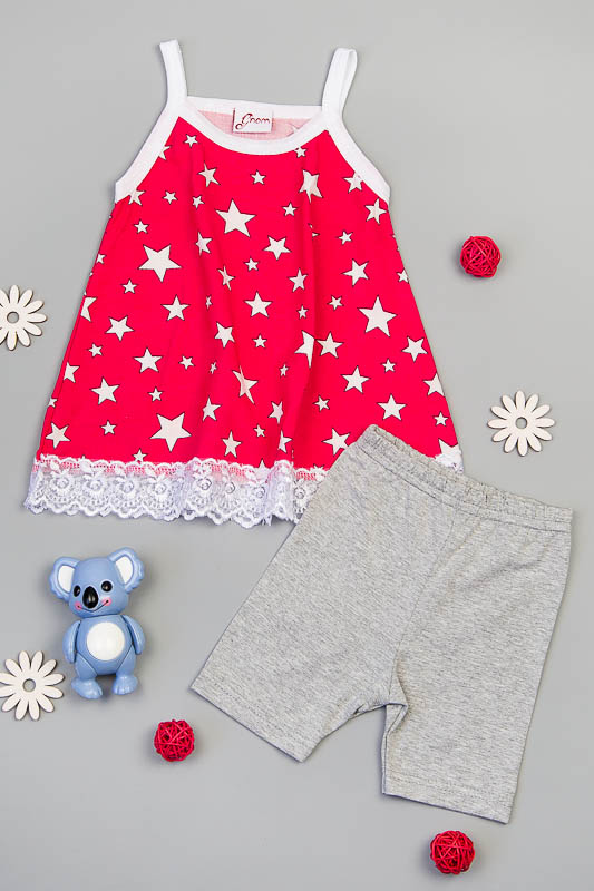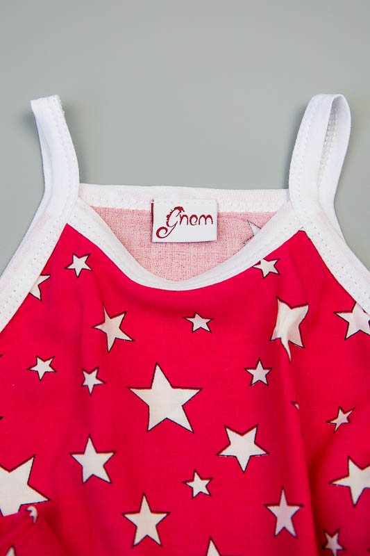 Модний одяг для маленьких діток - це перш за все, ті речі, в яких малюк буде відчувати себе комфортно. При цьому особлива увага приділяється закрию, моделі, матеріалами і фурнітурі. ТМ «Гном» пропонує річний комплект для самих маленьких, що складається з укороченого сарафанчика на бретелях і еластичних трес. Сарафан прикрашений широкою мереживною тасьмою. Виріб пошито з набивного штапеля - тонкої та легкої тканини. Це змішаний натуральний матеріал, що складається з 60% бавовни і 40% віскози. Він має масу переваг: дарує відчуття прохолоди в жарку погоду, добре пропускає повітря і вбирає вологу. Штапель не линяє і не вицвітає. Треси виконані з трикотажного віскозного полотна з додаванням еластану, що дає виробу хорошу розтяжність і не обмежує рух. Рекомендований догляд за комплектом - це ручне прання або машинне на малих обертах при температурі не вище 40 градусів із застосуванням м'якого миючого засобу, прасування виконують при невисокій температурі.\