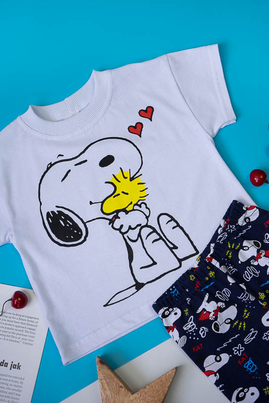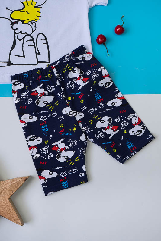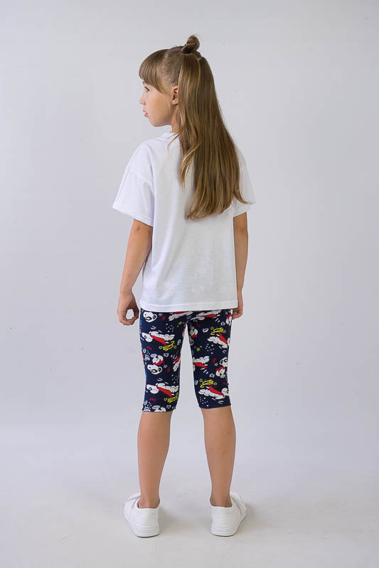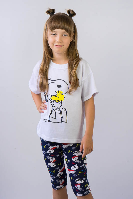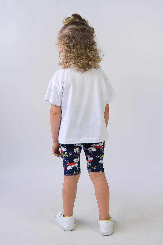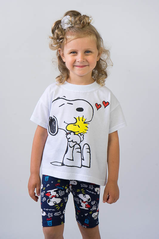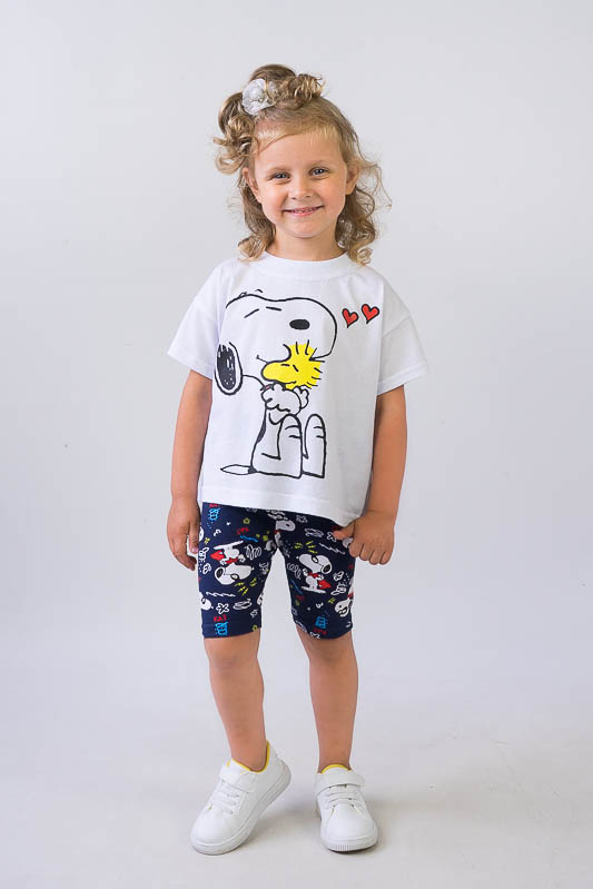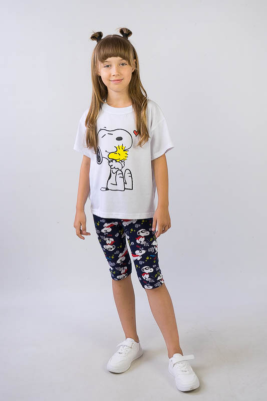 Легкий і практичний літній комплект для дівчаток від ТМ «Гном» - ідеальний варіант для активного відпочинку. Складається комплект з об'ємної футболки в стилі «oversize» і зручних еластичних трес. Об’єднує частини комплекту загальний малюнок персонажу коміксів - песика Снупи. Виготовлений комплект з комбінації різних трикотажних полотен - куліра і фулікри. Основою цих полотен є бавовна. Однак для еластичності в фулікру додана лайкра, через що цей матеріал ще називають стрейч-кулір. Це сприяє полотну не витягуватись і зберігати форму після численних прань. В цілому комплект добре вбирає вологу, не сідає, тримає форму, гіпоалергенний, що дуже важливо в спекотну літню погоду. Виріб невибагливий у догляді, його можна прати при температурі до 40°C в делікатному або ручному режимі, не використовувати відбілювачі або порошки з відбілювачами.