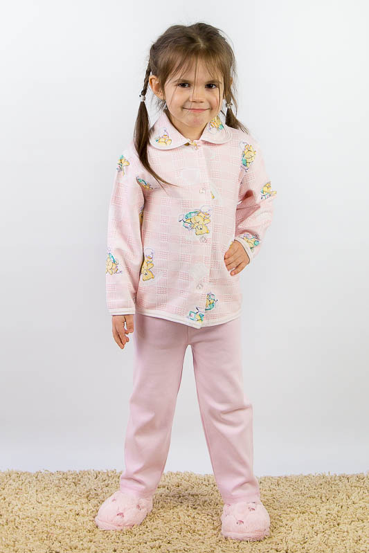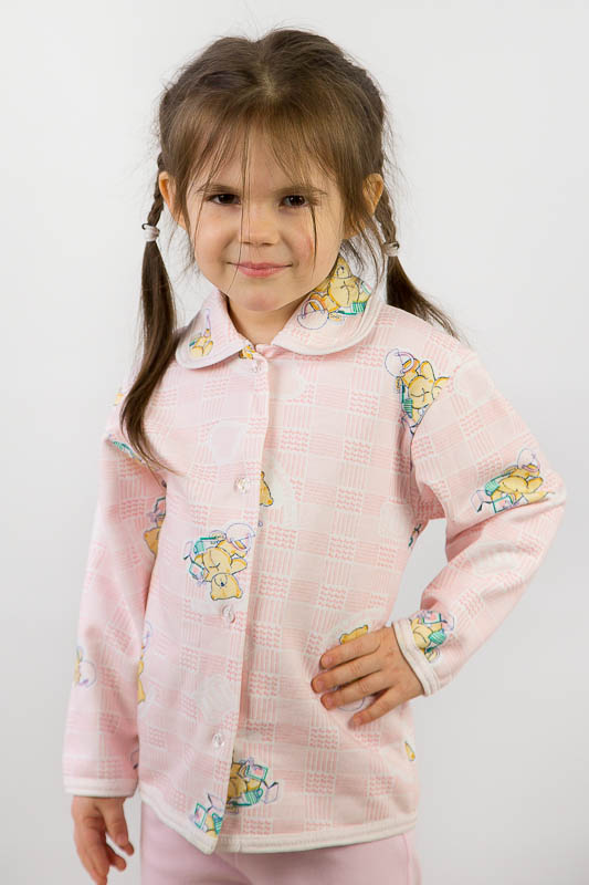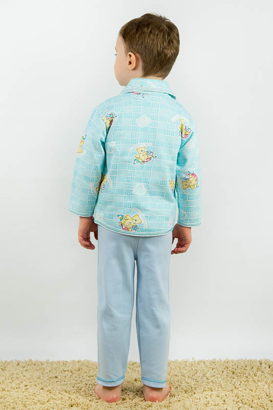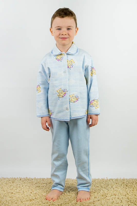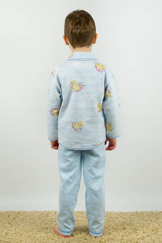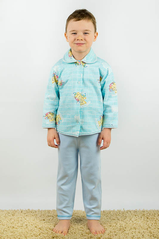 Легка і при цьому щільна піжама на ґудзиках підійде дітям 5-6 років. Колірна комбінація, а так само відкладний комірець надають їй стильний вигляд. Піжама виготовлена з поєднання утеплених трикотажних полотен. Це футер і інтерлок, зворотний бік яких має легкий і м'який начіс, що робить виріб теплим і комфортним. Полотна стійкі до появи затягувань і ковтунів. Однак є деякі негативні моменти - матерії погано реагують на вплив високих температур при пранні. Тому, щоб піжама не дала усадку, прати її рекомендують при температурі не вище 30-40 градусів. Гладити потрібно з лицьового боку.