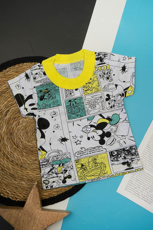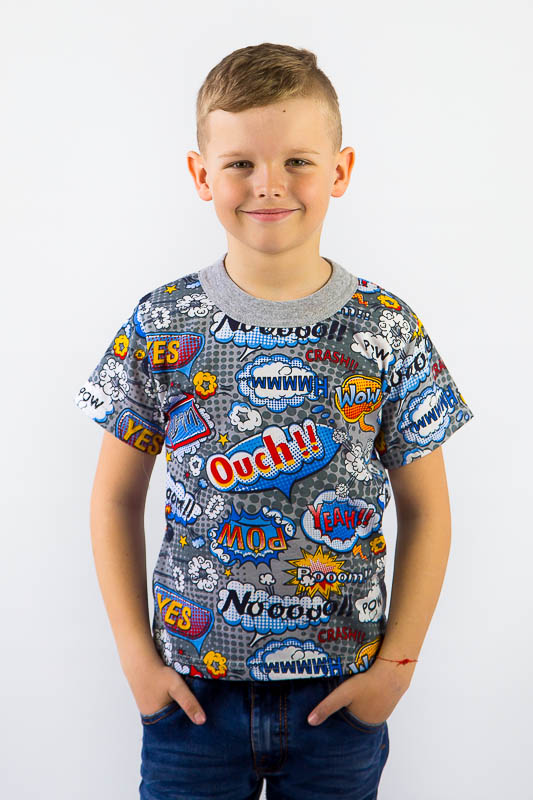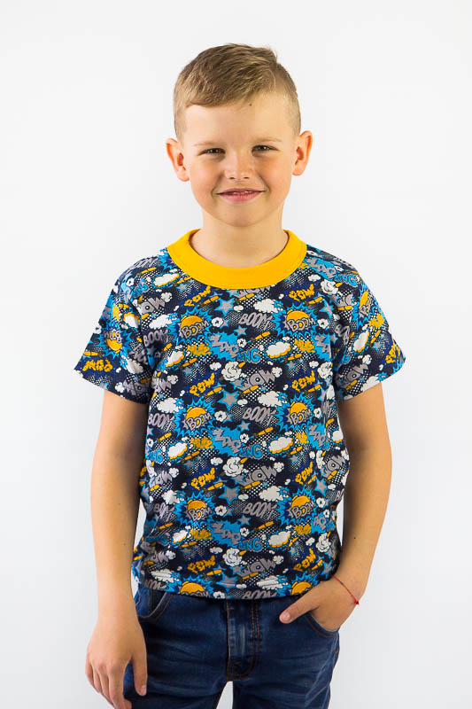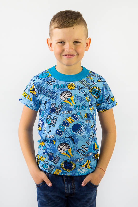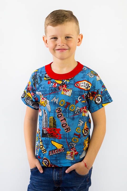 Яскрава кольорова футболка. Горловина окантована бейкою. Полотно - кулір. Підійде хлопчикам і дівчаткам зрістом від 80 см до 1 м 40 см. На прогулянку і в дитячий садок. У двір і в школу.