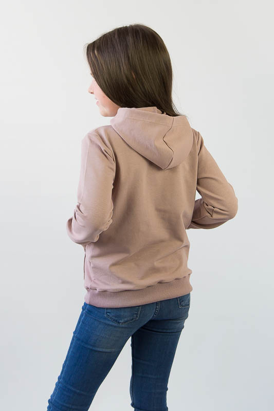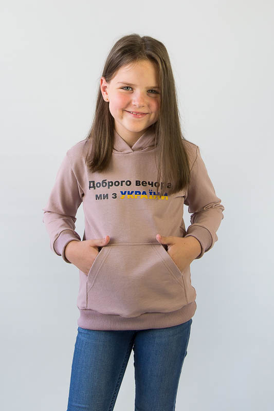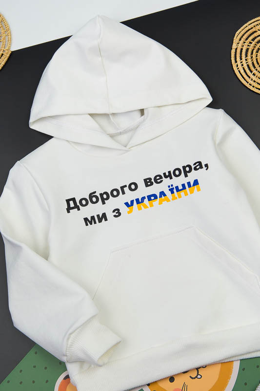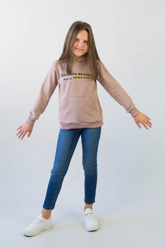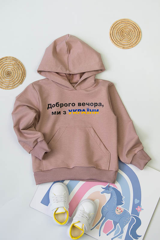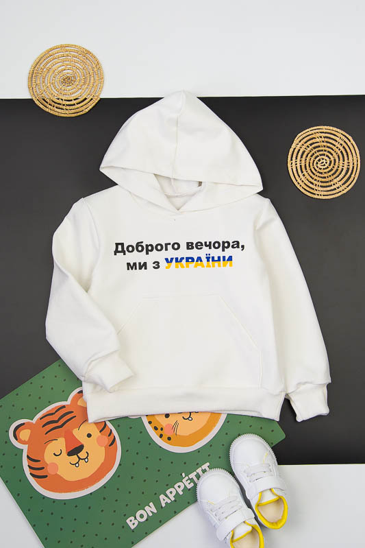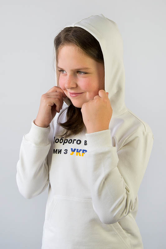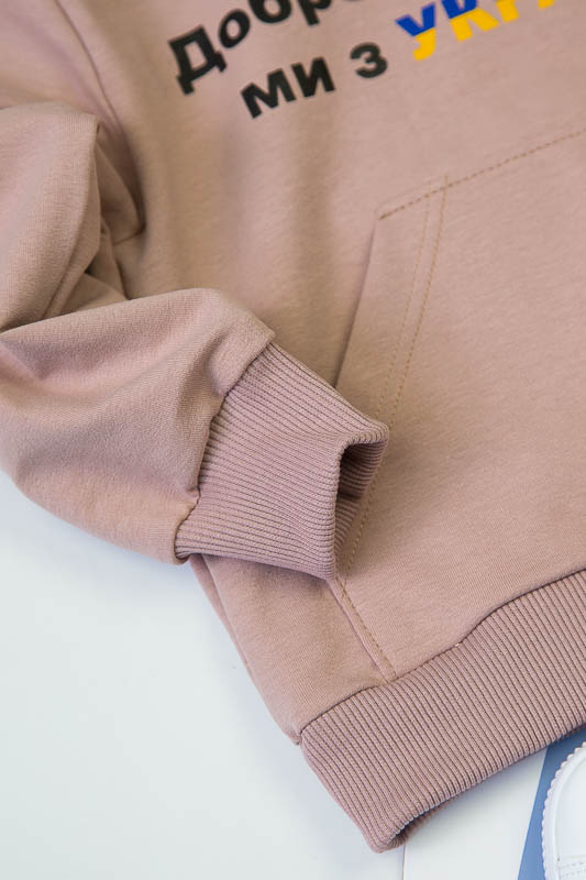 Однотонний худі з капюшоном від ТМ «Гном» виконаний в різноманітній кольоровій гамі, яку можна вибрати як хлопчикам, так і дівчаткам. Модель має вільну посадку по силуету, але при цьому не надає йому мішкуватості. Прямі лінії крою, оптимальна довжина до середини лінії стегна дозволяє комбінувати вироби з різними елементами одягу: штанами, шортами або лосинами. Передня частина худі прикрашена патріотичним малюнком і оформлена місткою кишенею-кенгуру. Зрізи рукавів і низ виробу оброблені еластичним матеріалом в основний тон. Модель виготовлена з трикотажного полотна - двунитка. Ще його називають футер двунитка. Трикотаж футер має позитивні споживацькі якості: добре вбирає вологу; ефективно пропускає повітря; має теплоощадну здатність; не утворює пилей (ковтунів); не витягується при носінні; простий у догляді. Матеріал слід прати в теплій воді. Він добре відмивається. Температура води, рівна 30°С, буде достатньо для якісного прання матеріалу. Через наявність малюнка, прасувати рекомендується тільки з виворотної сторони.