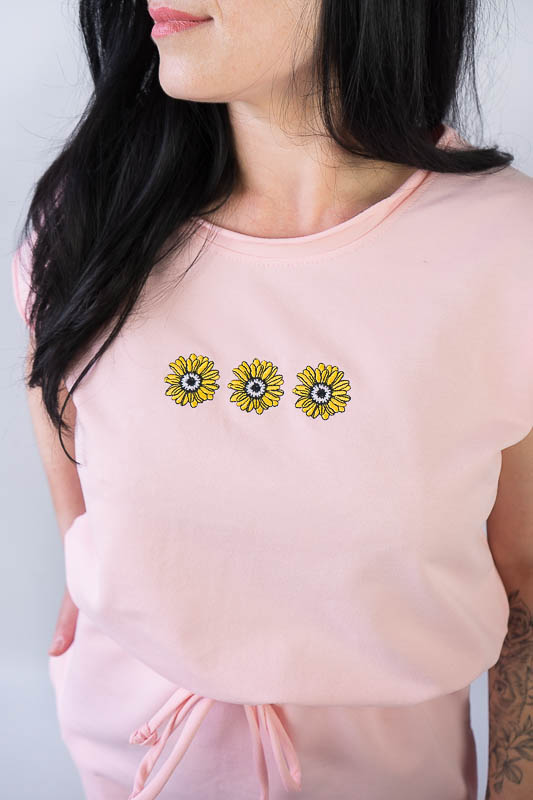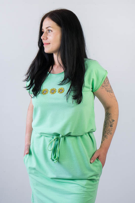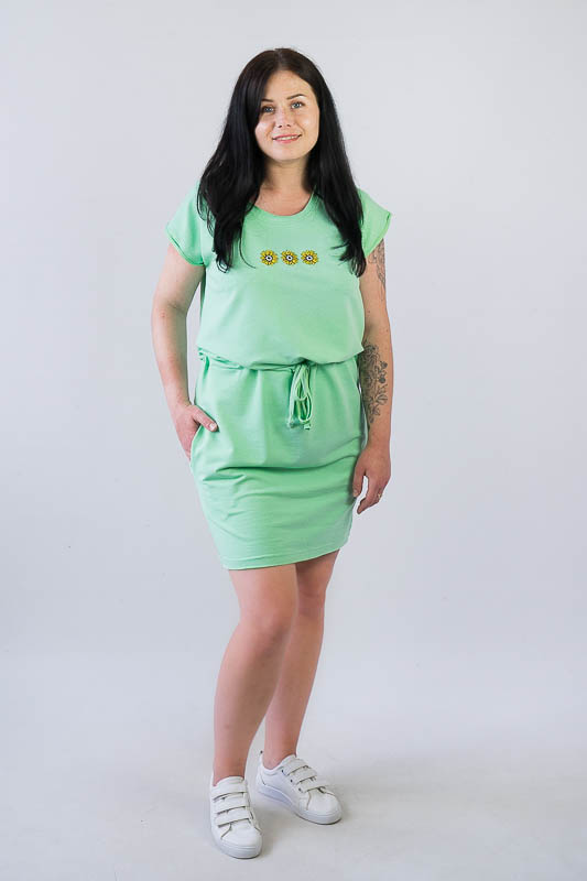 Легка спортивна сукня зі спущеним плечем від ТМ «Гном» - відмінний варіант для повсякденного носіння. Вільний крій, куліска по поясу та кишені в бічних швах у поєднанні з м'яким матеріалом робить сукню комфортною та зручною. Передню частину виробу прикрашає невелика вишивка. Виготовлена модель із трикотажного полотна – двунитка. Матеріал має позитивні споживчі якості: добре вбирає вологу; ефективно пропускає повітря; не утворює пилок (ковтунів); не витягується при носінні; простий у догляді. Сукню слід прати у теплій воді. Температури води, що дорівнює 30°С, буде достатньо для якісного прання матеріалу.