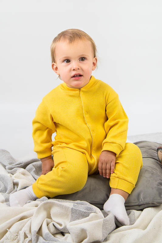 Одяг для немовлят в першу чергу повинний бути зручним і комфортним. Вільний крій, надійні кріплення, відсутність здавлюючих або натираючих шкіру резинок дозволяє дитині відчувати себе чудово незалежно від погоди. Ясельний комбінезончик від ТМ «Гном» повністю відповідає цим правилам, доповнюючи теплим матеріалом. Різноманітність кольорів дозволяє підібрати виріб як хлопчикам, так і дівчаткам. Для зручності в надяганні по всій довжині комбінезона розташовані застібки-кнопки, що переходить у внутрішній кроковий зріз, а зрізи ніжок оформлені манжетами. Виріб виконаний з еластичного трикотажного полотна з невеликим начосом, яке має в'язану фактуру англійської резинки 2*2. Полотно має високу розтяжність, дуже добре тримає форму. Оскільки це 100% бавовна, він пропускає повітря і дозволяє шкірі дихати. Підходить для повсякденного носіння в прохолодну пору року. Прати виріб рекомендується при температурі не вище 30-40°С. Прасувати потрібно з лицьового боку.