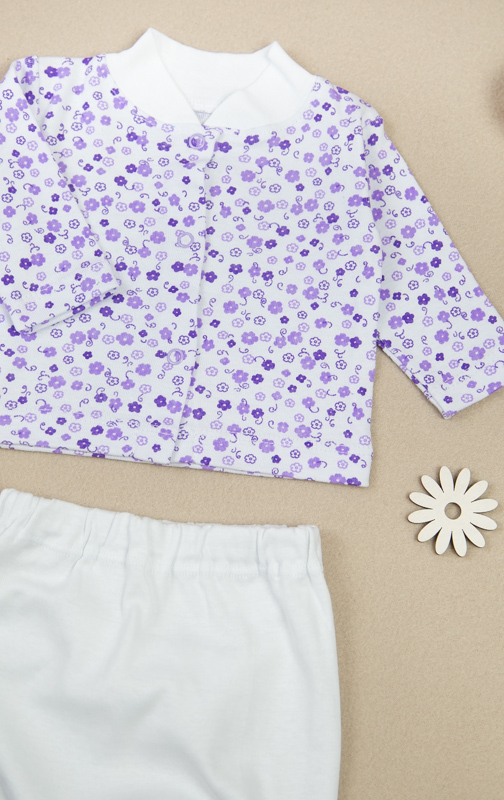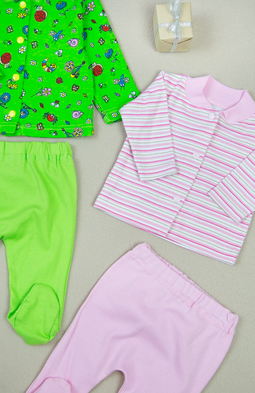 Комплект для самих маленьких складається з кофтинки на кнопках і повзунків. Виготовлений він з трикотажного полотна - рібана, яка користується великою популярністю у виробництві нижньої білизни і дитячого одягу. Матеріал містить 100% бавовна без добавок. Він абсолютно безпечний. Одяг з цього матеріалу можуть носити люди, які страждають алергією, а також діти з самого раннього віку. Вироби з рібани прекрасно зберігають форму, здатні витримати численні прання, не дають усадки, не покриваються катишками. При правильному догляді довгий час не втрачають первинний вигляд. Відмінно пропускає повітря і гігроскопічна, що забезпечує пухка будова матеріалу. Рекомендується прати у пральній машині при температурі води не більше 30 ° С.