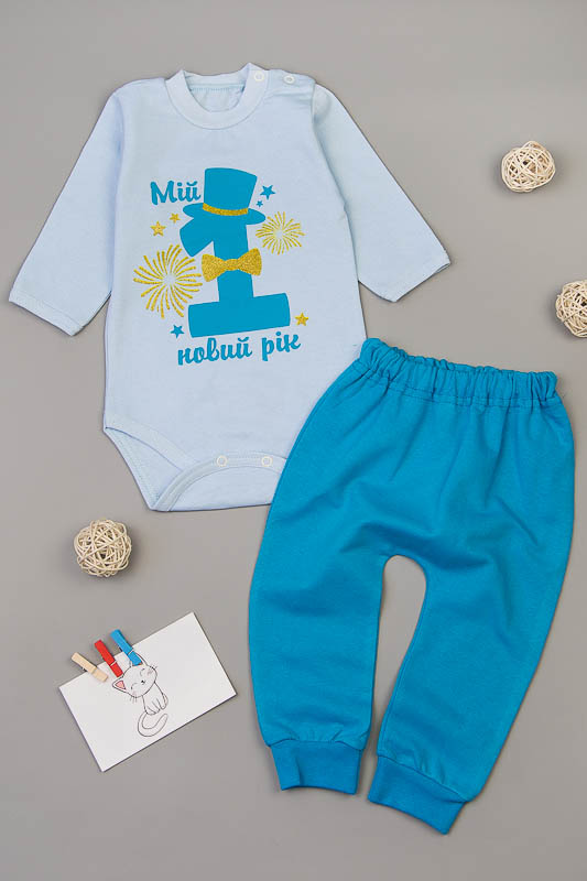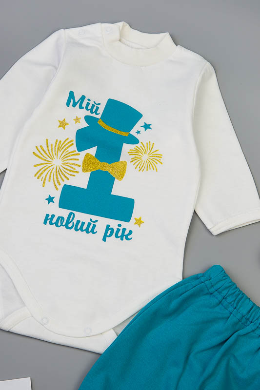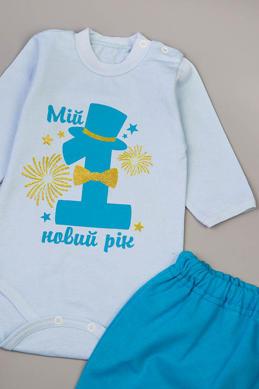 Комплект ясельний "Мій перший новий рік" пошитий з трикотажного полотна - начісування. У цього полотна лицьова сторона гладка, а виворітна з м'яким теплим начосом. В одязі з такого полотна Вашій дитині буде тепло і затишно. Начісування досить міцний, тому витримає будь-які навантаження, навіть самі інтенсивні руху не викличуть зламів або складок на речах. Полотно стійко до появи затягувань і катишков. Комплект з такого полотна зручний, практичний і прослужить Вам дуже довго. Декороване накатом. Накат не линяє і не облазить. Штанці розраховані під памперс.