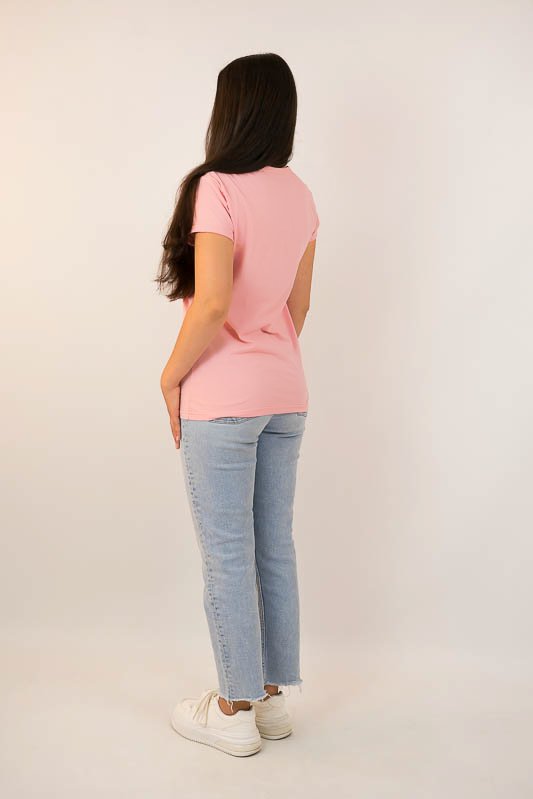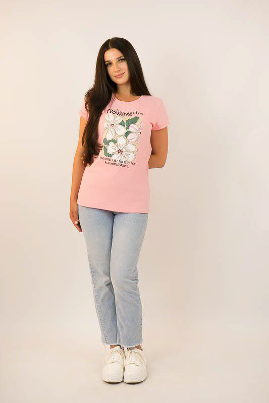 Жіноча футболка класичного крою виконана в різних варіантах кольору і прикрашена малюнками. Виготовлено футболку з трикотажного полотна – кулір. Це бавовняне полотно, яке добре вбирає вологу, не сідає, тримає форму, гіпоалергенне. Рекомендований догляд за виробом – це ручне прання або машинне на малих обертах при температурі не вище 40°C із застосуванням м'якого миючого засобу, прасування виконують при невисокій температурі.