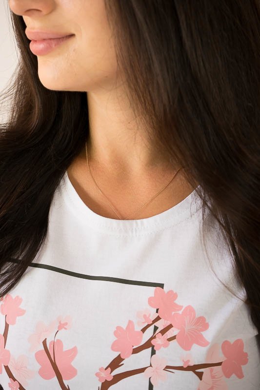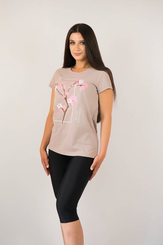 Жіноча футболка класичного крою виконана в різних варіантах кольору і прикрашена малюнками. Виготовлено футболку з трикотажного полотна – кулір. Це бавовняне полотно, яке добре вбирає вологу, не сідає, тримає форму, гіпоалергенне. Рекомендований догляд за виробом – це ручне прання або машинне на малих обертах при температурі не вище 40°C із застосуванням м'якого миючого засобу, прасування виконують при невисокій температурі.