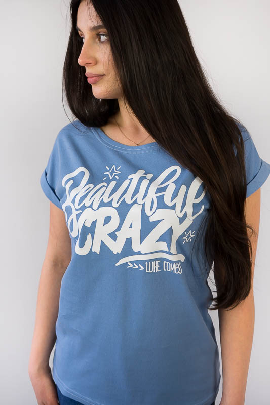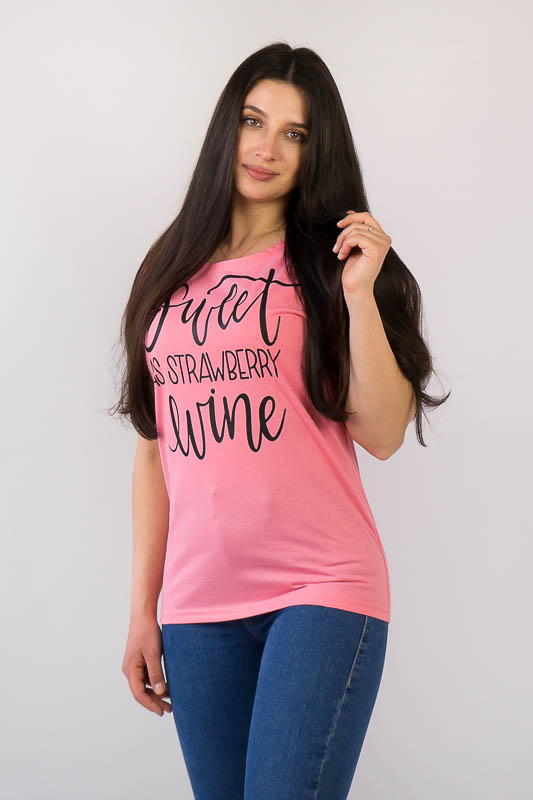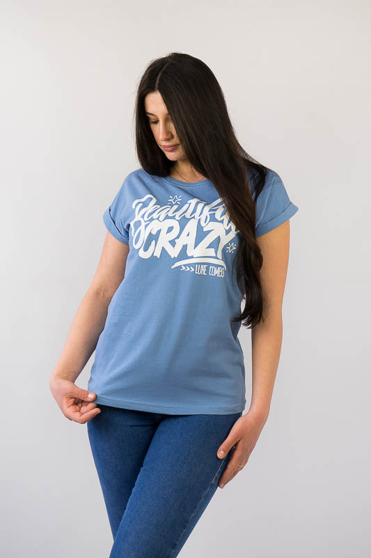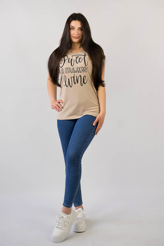 Жіноча футболка зі спущеним плечем виконана в різних варіантах кольору і прикрашена малюнками. Виготовлено футболку з трикотажного полотна – кулір. Це бавовняне полотно, яке добре вбирає вологу, не сідає, тримає форму, гіпоалергенне. Рекомендований догляд за виробом – це ручне прання або машинне на малих обертах при температурі не вище 40°C із застосуванням м'якого миючого засобу, прасування виконують при невисокій температурі.